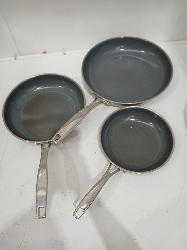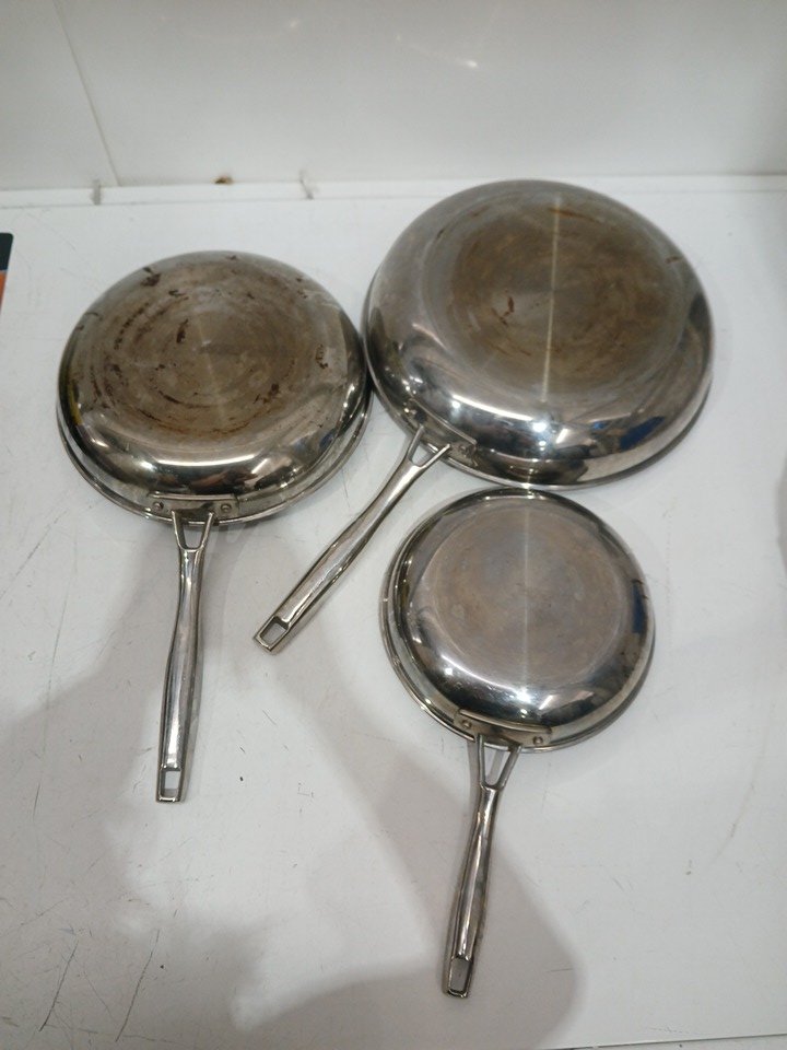 heavy signs of use on front and backside of all pans. Burnt Marks and heat stress on bottom side of pans.