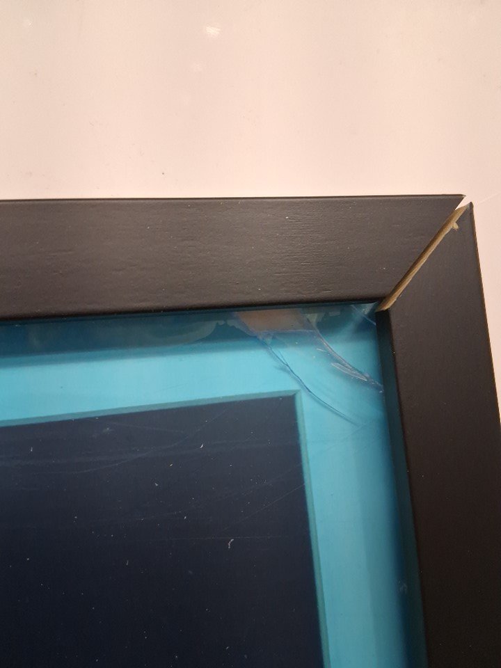the frame has damage on the corner and the back wood frame is damaged as well (see photos).