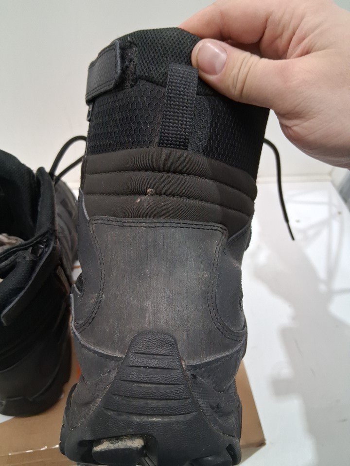 Product's soles have some rocks and dirt caked into them, the exterior of these boots also have some mud and dirt staining which looks loose enough to clean. Still these boots have a worn appearance and feel. The inside tag has also worn or been damaged so we can not confirm that they are the true size.