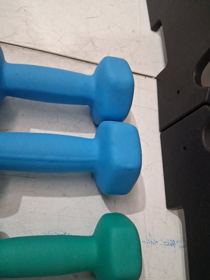 Please note that both of the 8lb dumbbells are missing as well as the brackets for the stand (see photos). There also appears to be slight wear on both 5lb dumbbells as well as one of the 3lb dumbbells (see photos).