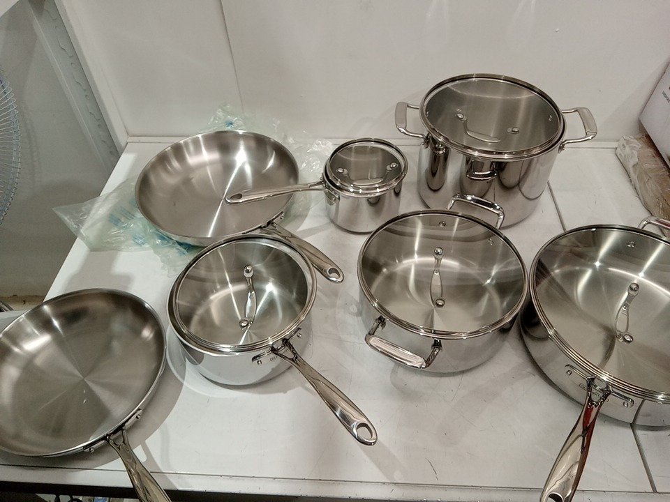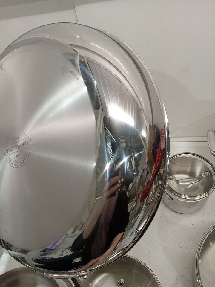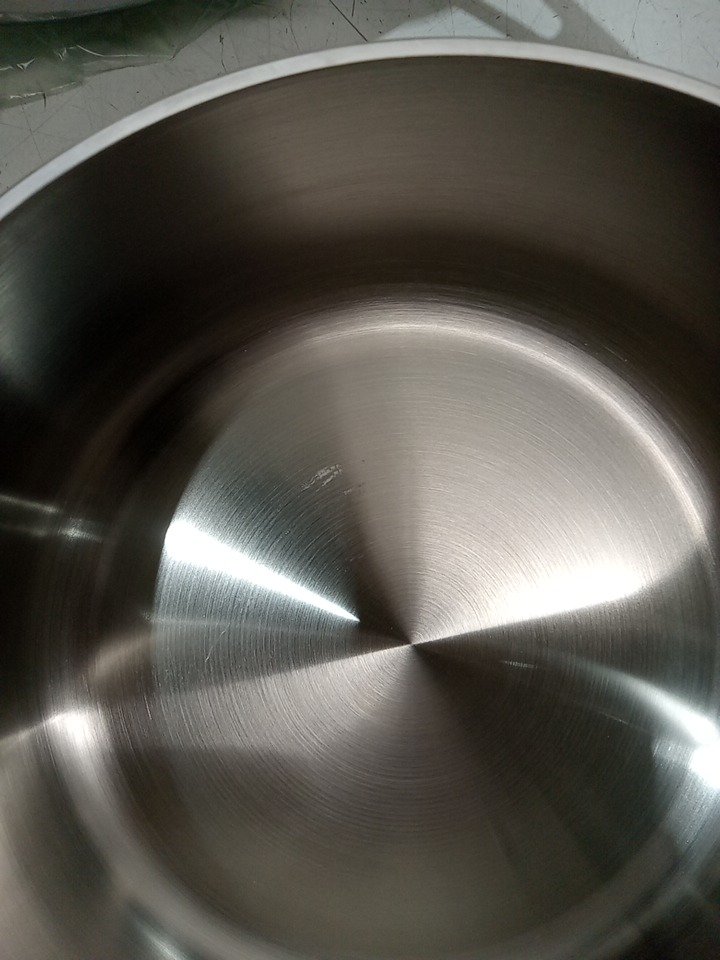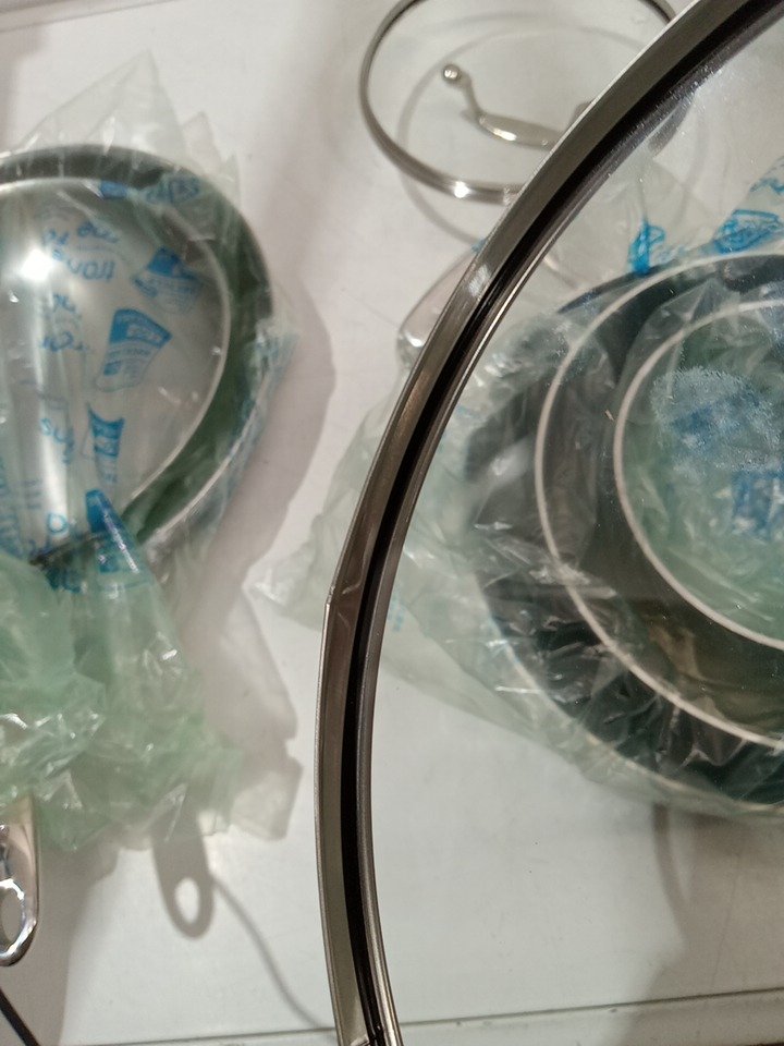 Marks on some of the pots/pans, and one of the lids is slightly dented, does not appear to affect function, likely from shipping/handling