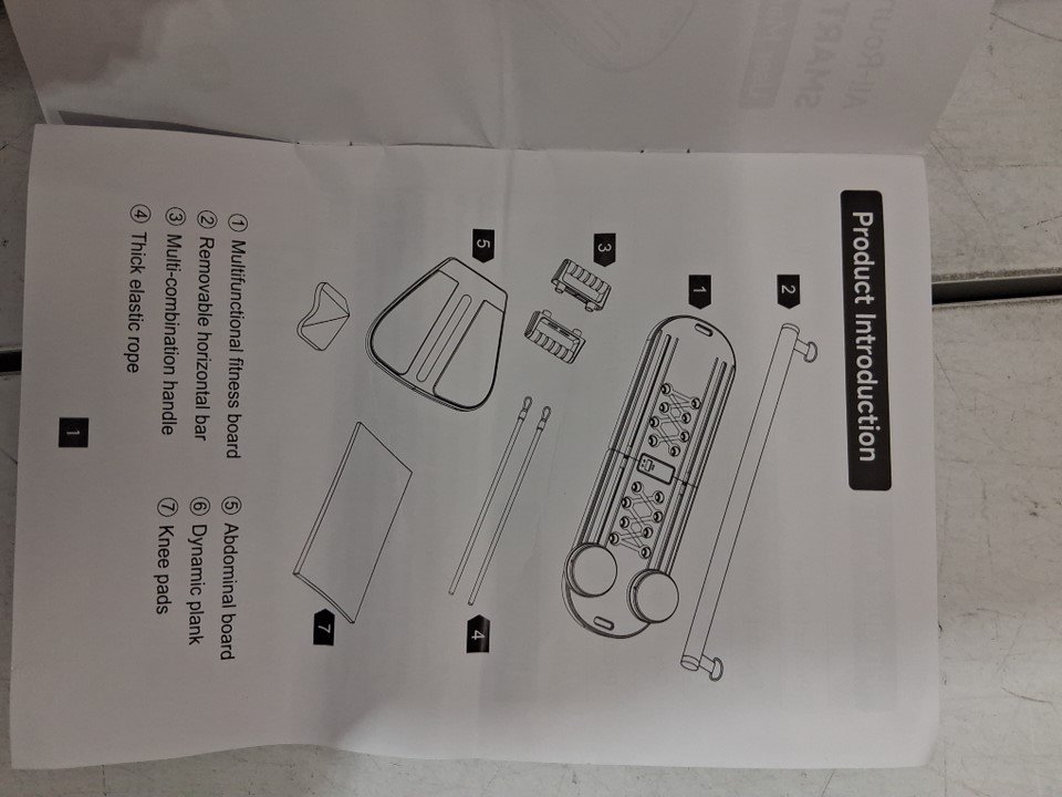 Signs of previous use indicated by various hair found around the product, as well as the product is unfortunately missing: - removable horizontal bar - thick elastic rope - knee pads Tested for power.