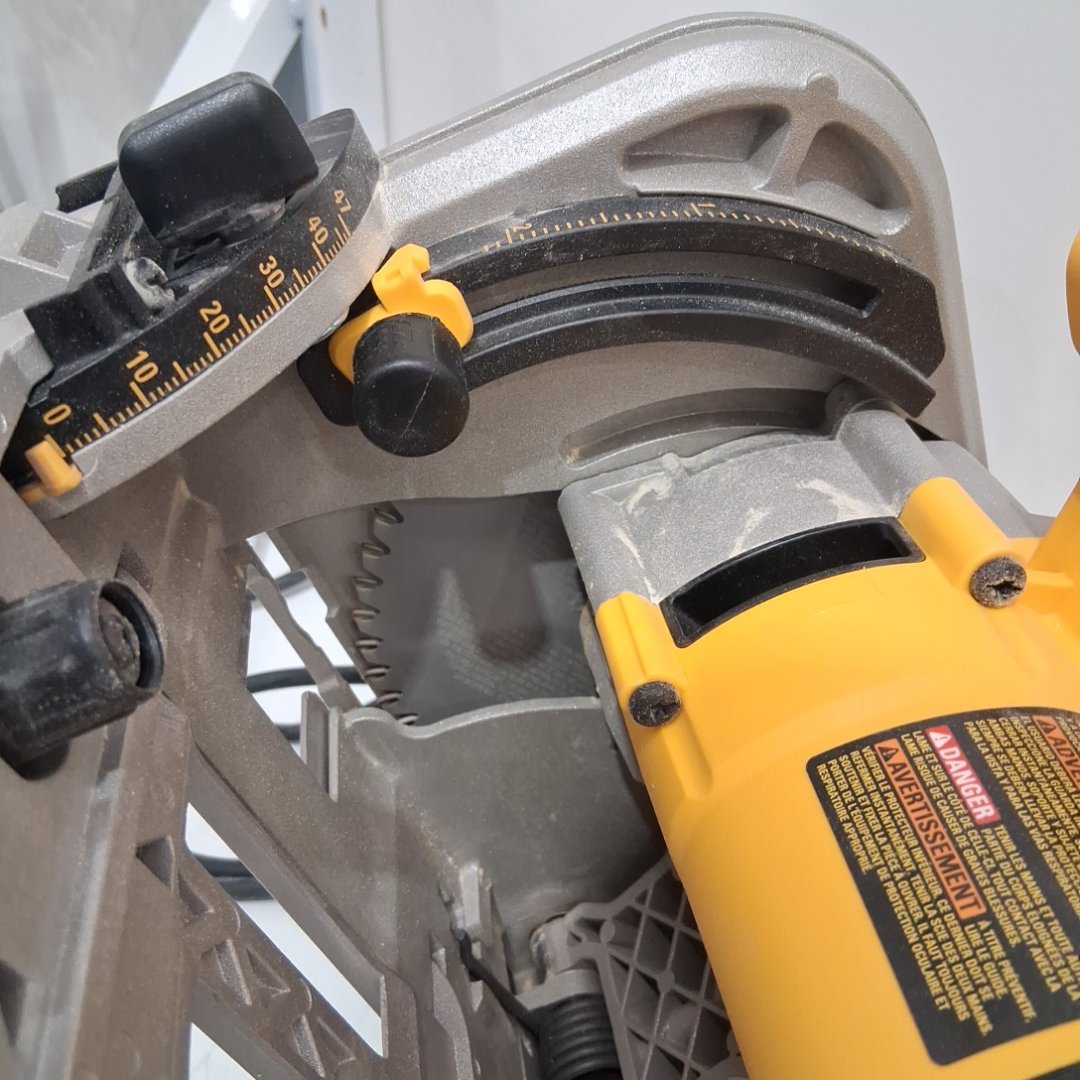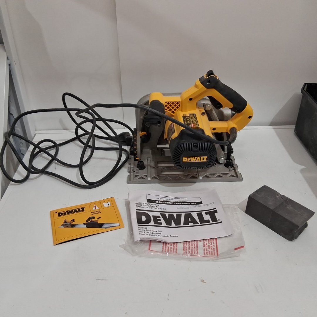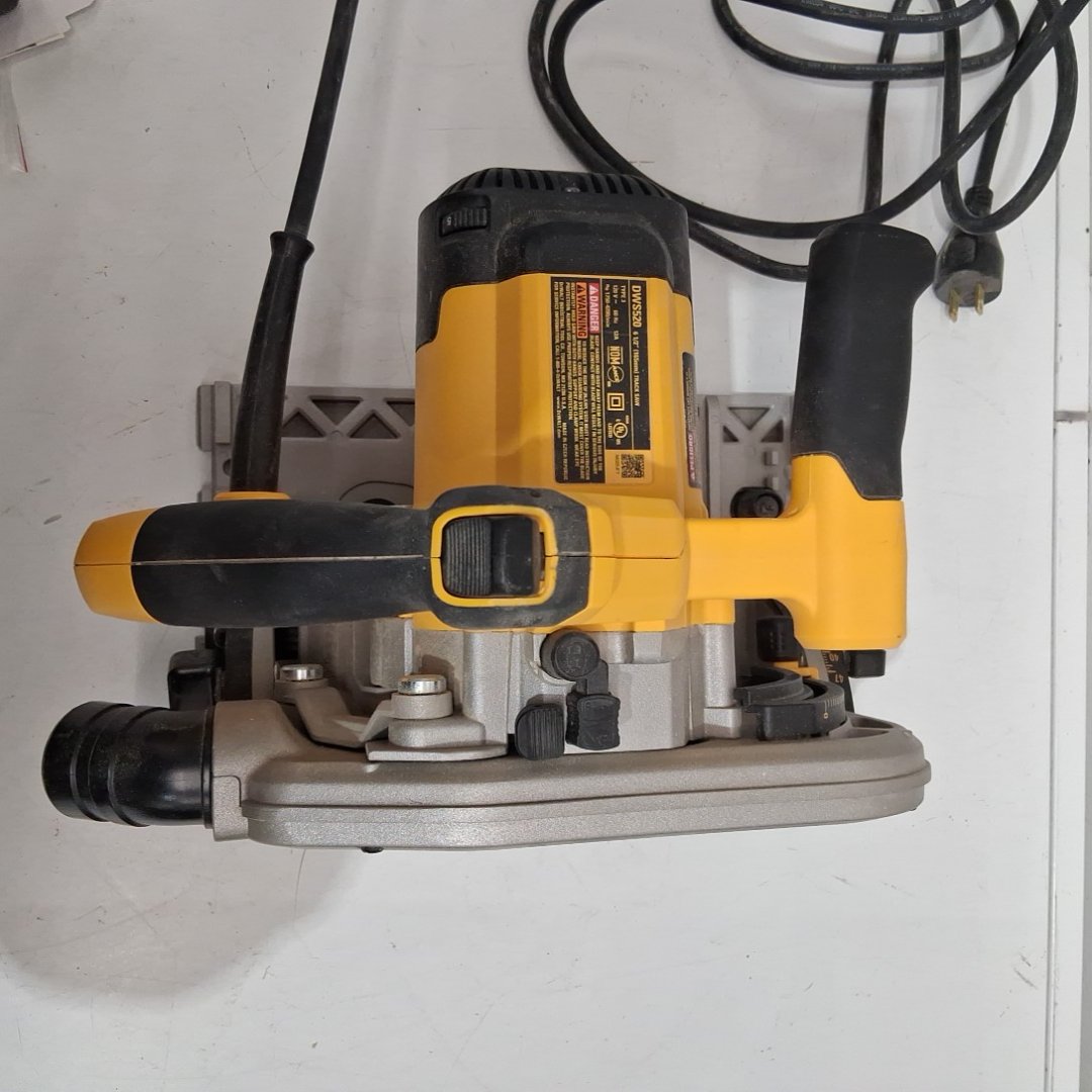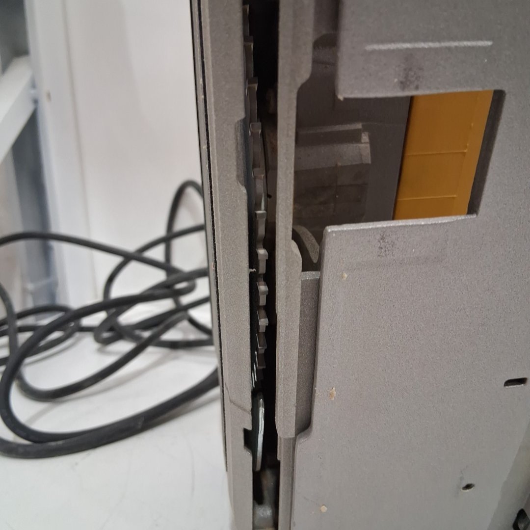 The blade wobbles a bit when turned on. There is light dust on the saw from previous use. Tested for power.