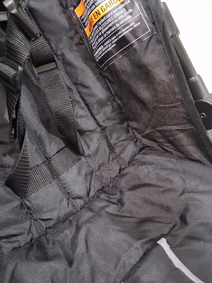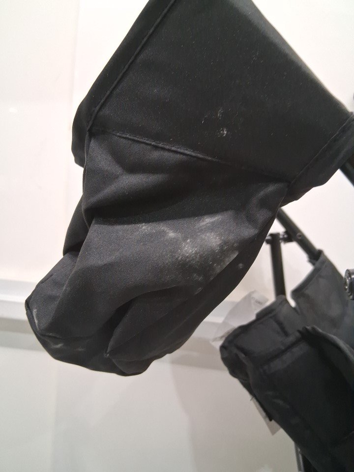 There is some light dust marks on the fabric of the cup holder. some crumbs were found inside the seat area of the product.