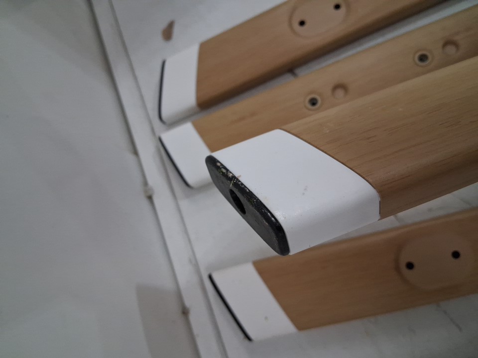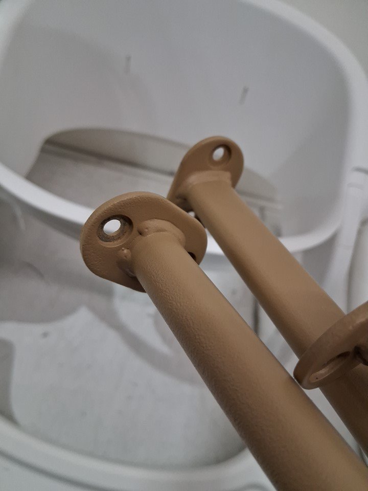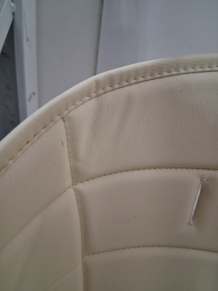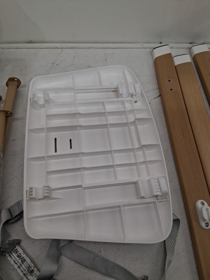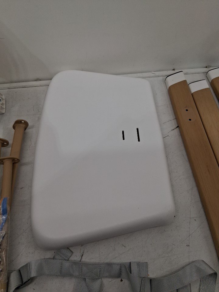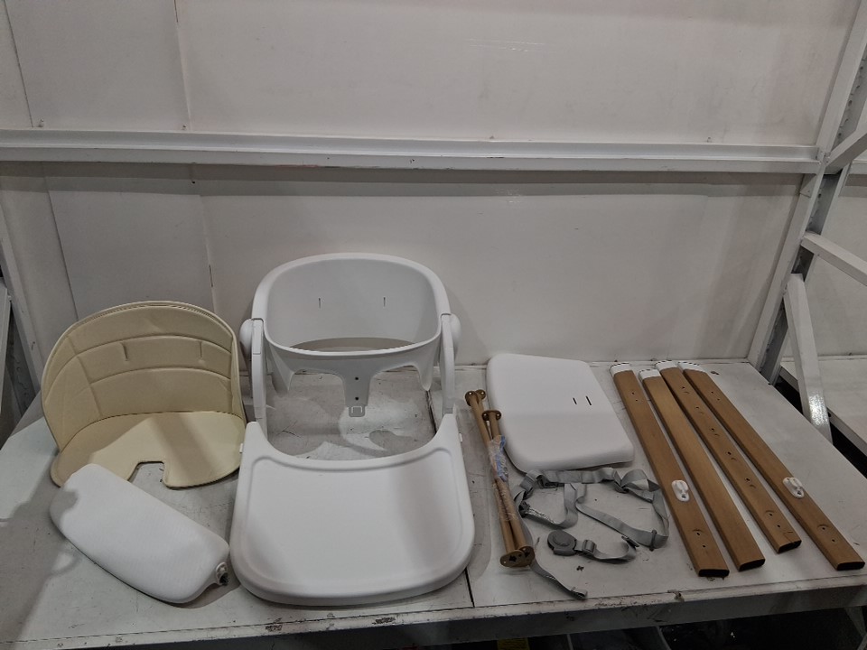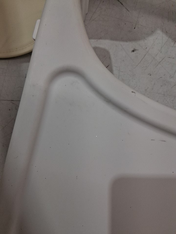item has some light scuffs on tray and feet and some light marks at installation points. seat pad has a few light marks from previous light use please note instructions are missing and general hardware may be required for assembly