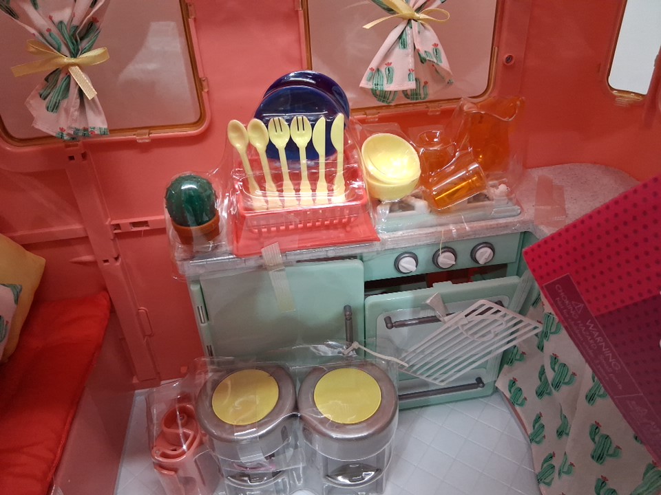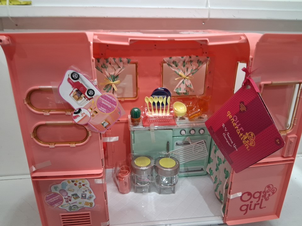 28pc kids Our Generation Camping Trailer Doll Vehicle - for 18" dolls - pink (model: BD37445Z)