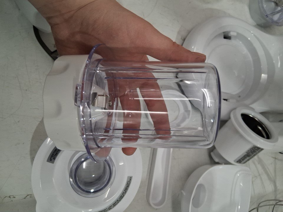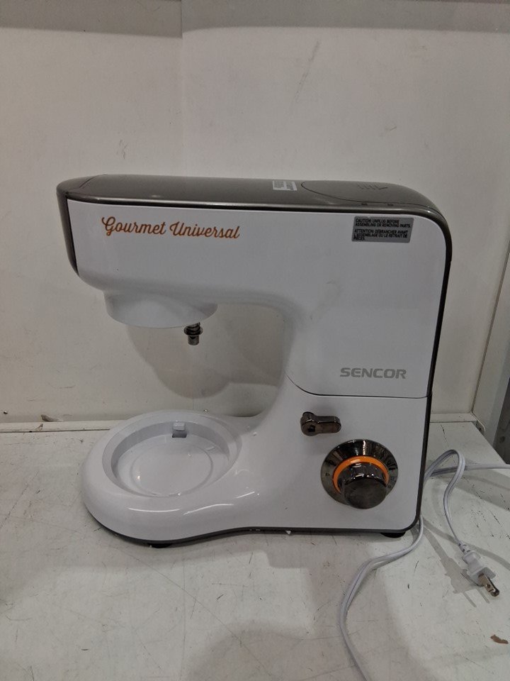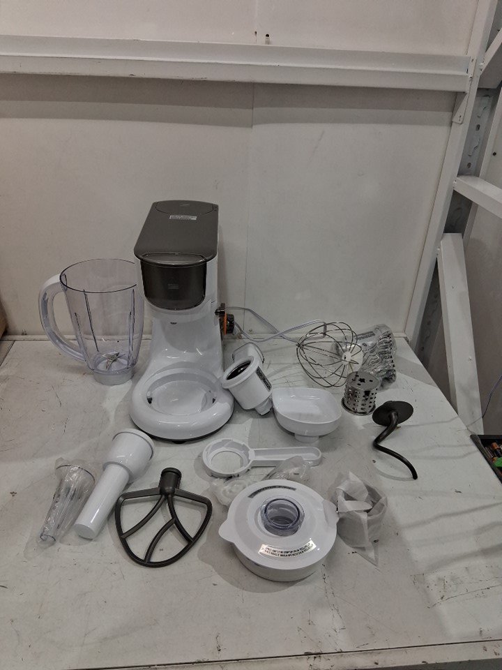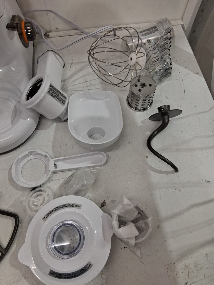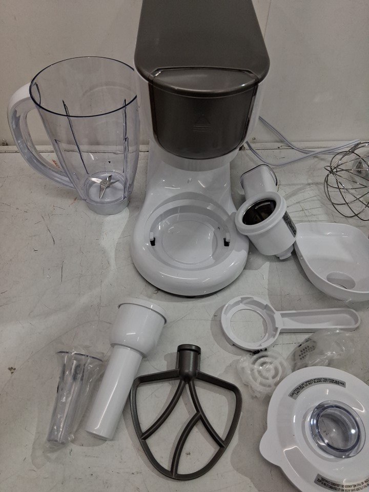 Small scuff on main body of mixer and is missing large mixing bowl as well as some of the smaller white noodle maker attachments (See photos)