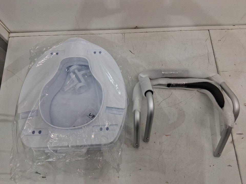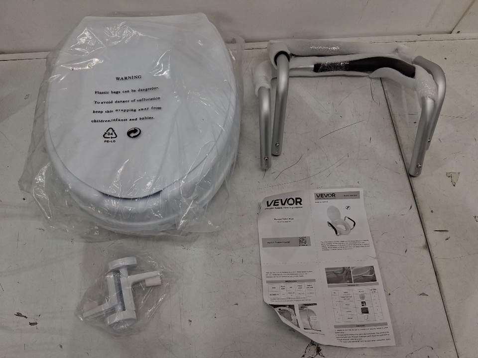 vevor raised toilet seat with arms - 4" - 300lb capacity - white/black (model: sc7060d-4a)