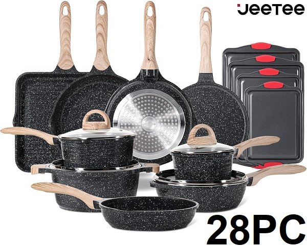 28pc jeetee pfoa-free nonstick induction granite pot and pan set - black/grey