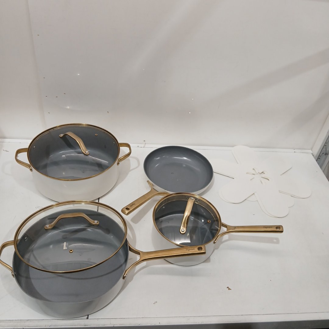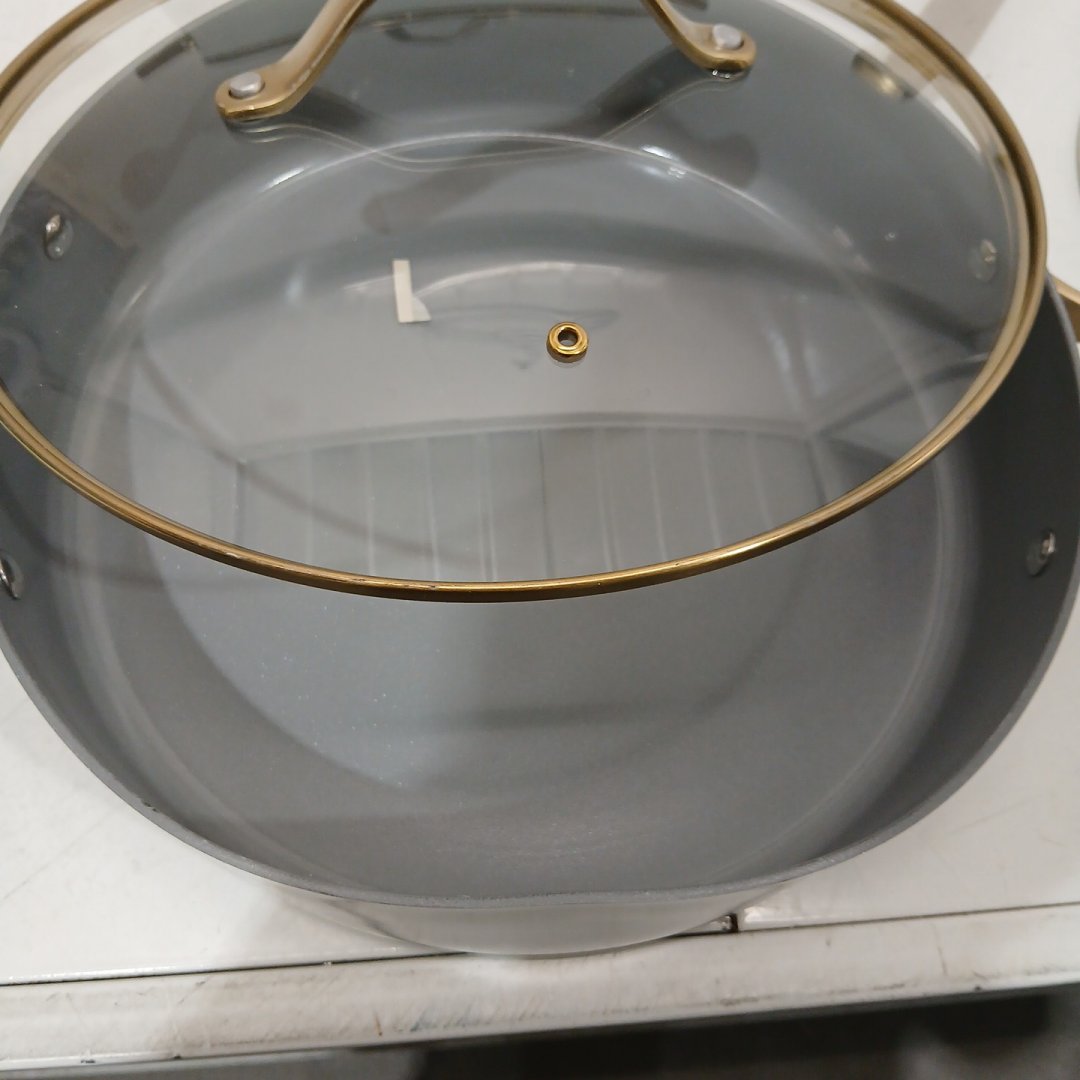 This product does have some cosmetic & damage issues. Scuffs present, almost on every item. Signs of previous use on the bottoms. One rim is very dented and the lid does not fit into place. Please be aware we have inspected this product to the best of our knowledge, however; These items still have to go through storage & bid pick up/transportation which may result in additional scuffs not pictured due to shifting around during this process.