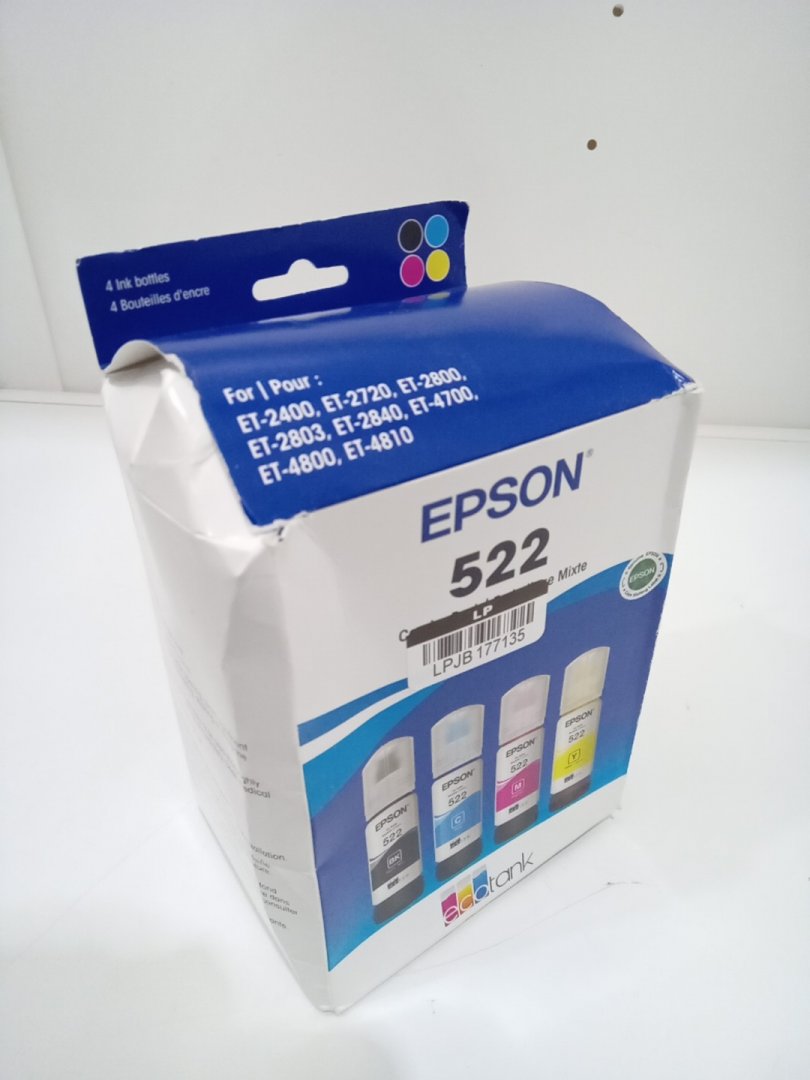 4PC Epson 522 Combo Pack Ink Refill Bottles for Select EcoTank Printers - 65mL Each - Black, Cyan, Magenta, Yellow (Model: T522120-BCS)