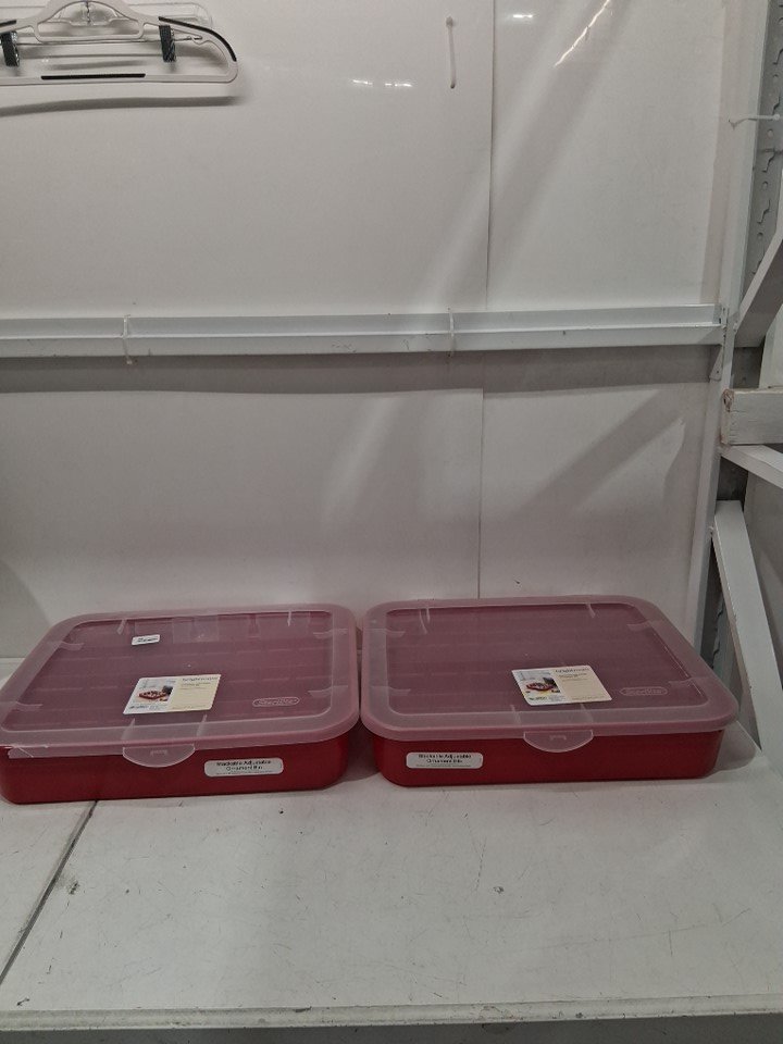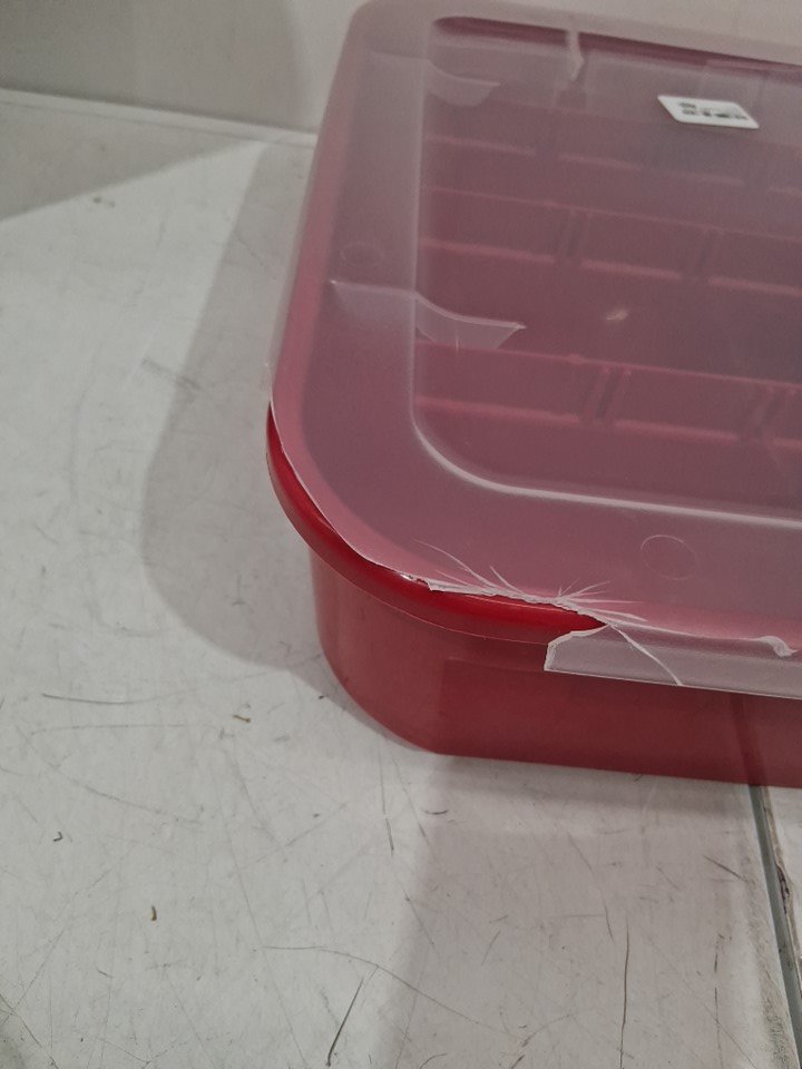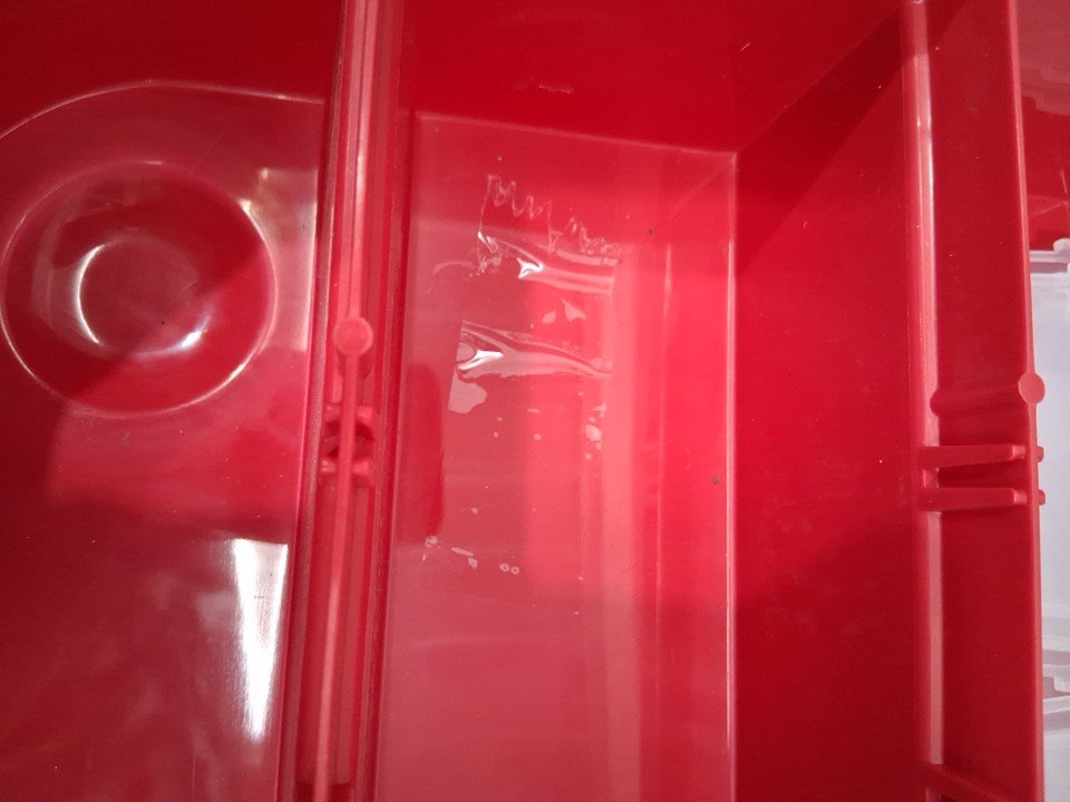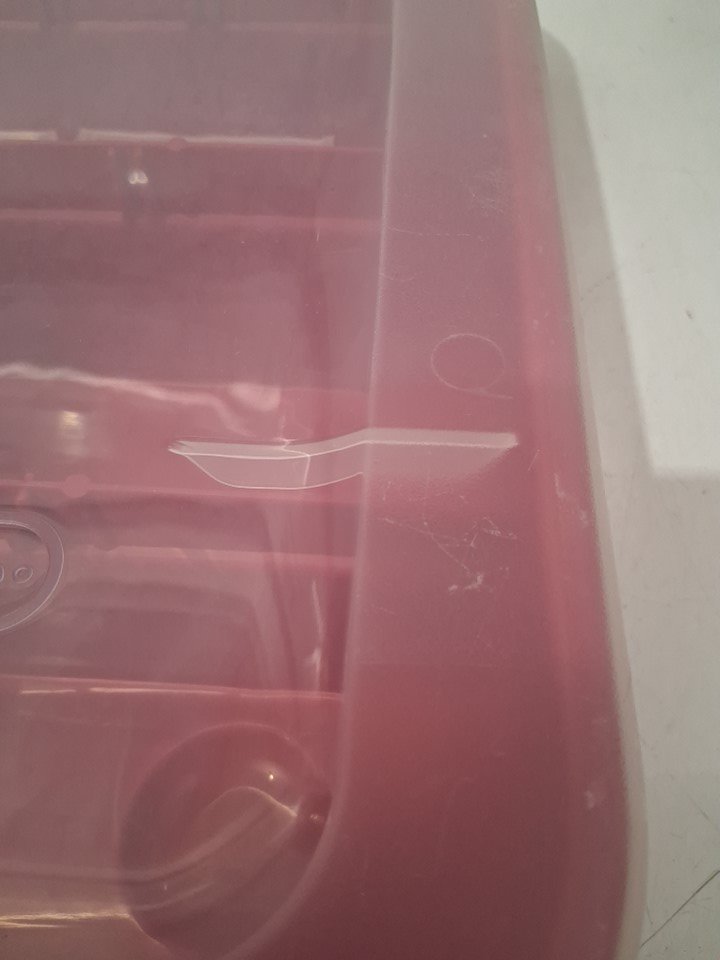 One of the lids are cracked and the surface has some scuffing from shipping. On of the bins has some tape inside.