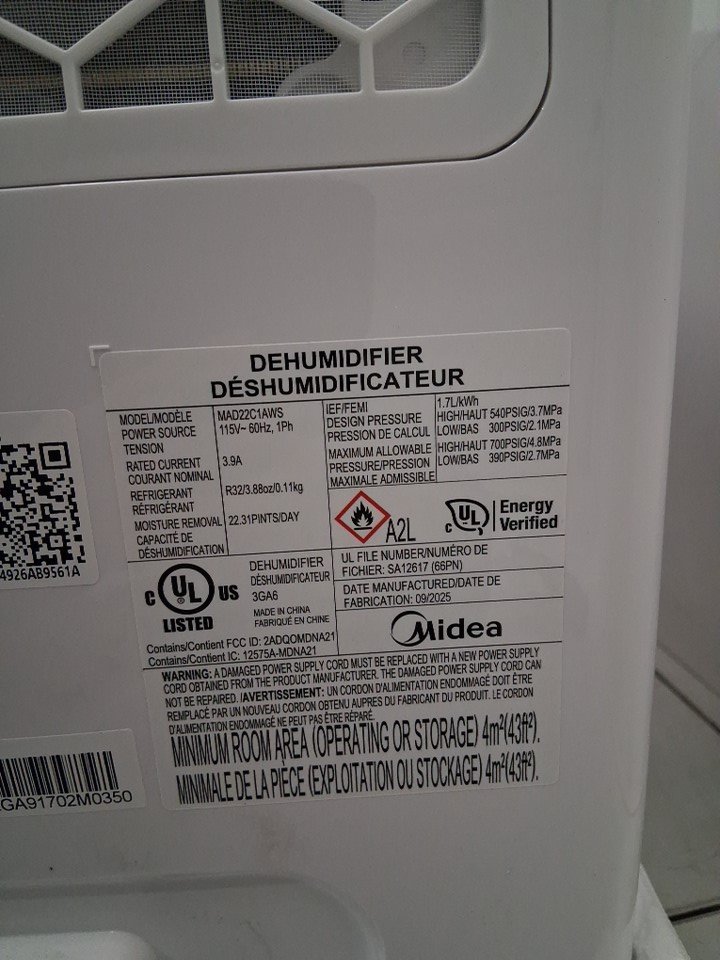 MIDEA EASYDRY DEHUMIDIFIER WITH DIGITAL DISPLAY - 1500SQ.FT. COVERAGE - WHITE (MODEL: MAD22C1AWS)