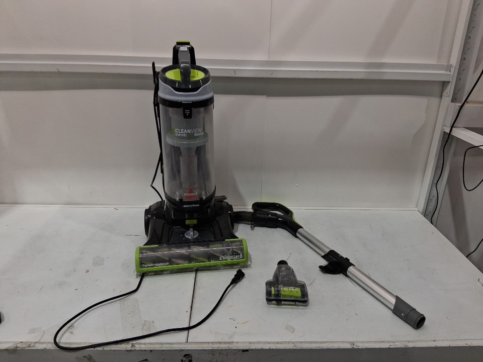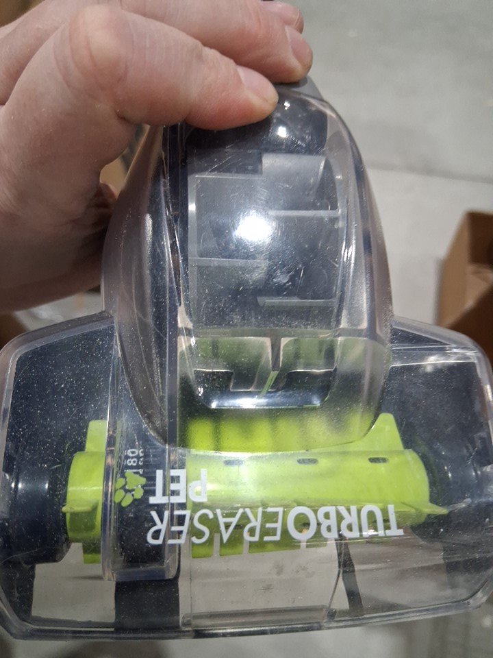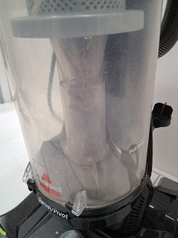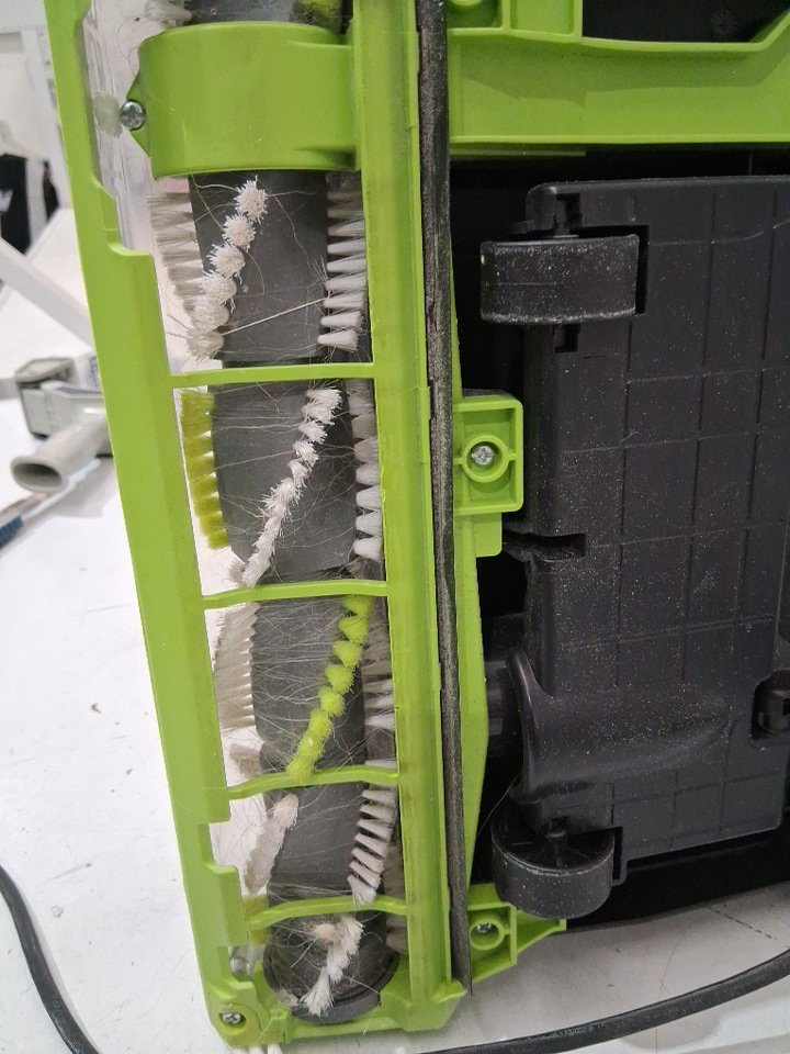 item shows signs of light use, dust and debris inside vacuum canister, hair in the floor rollers ( see photo)