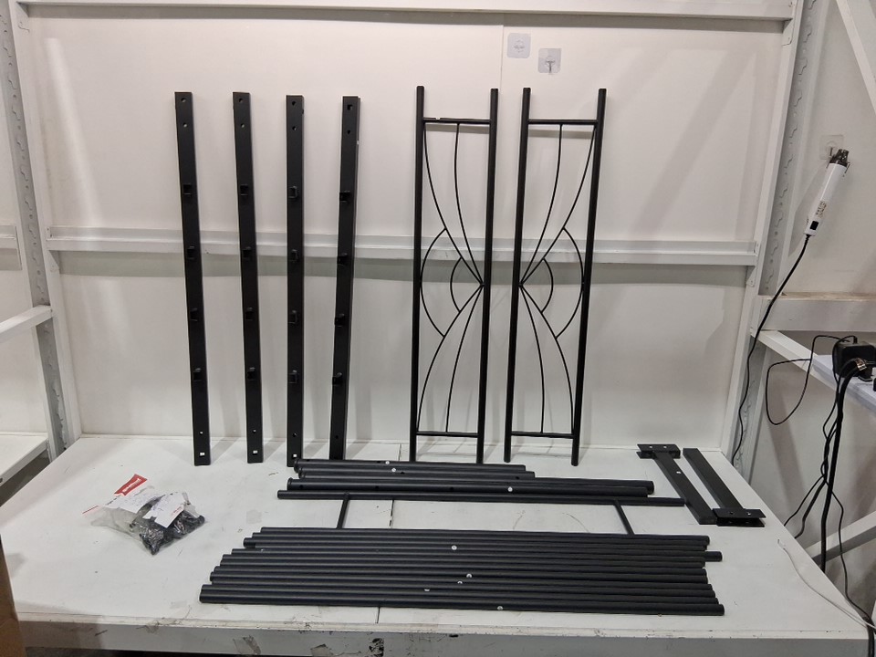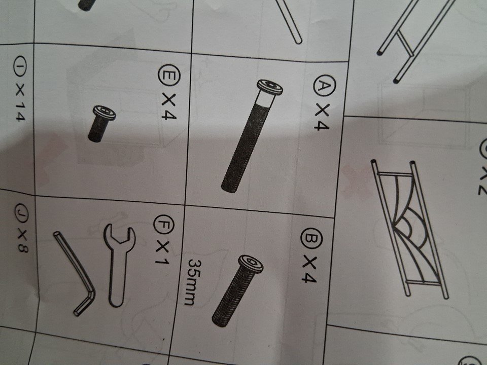 item is missing "E" generic hardware ( see manual photo) item also has dings in the paint on some pieces ( see photos)