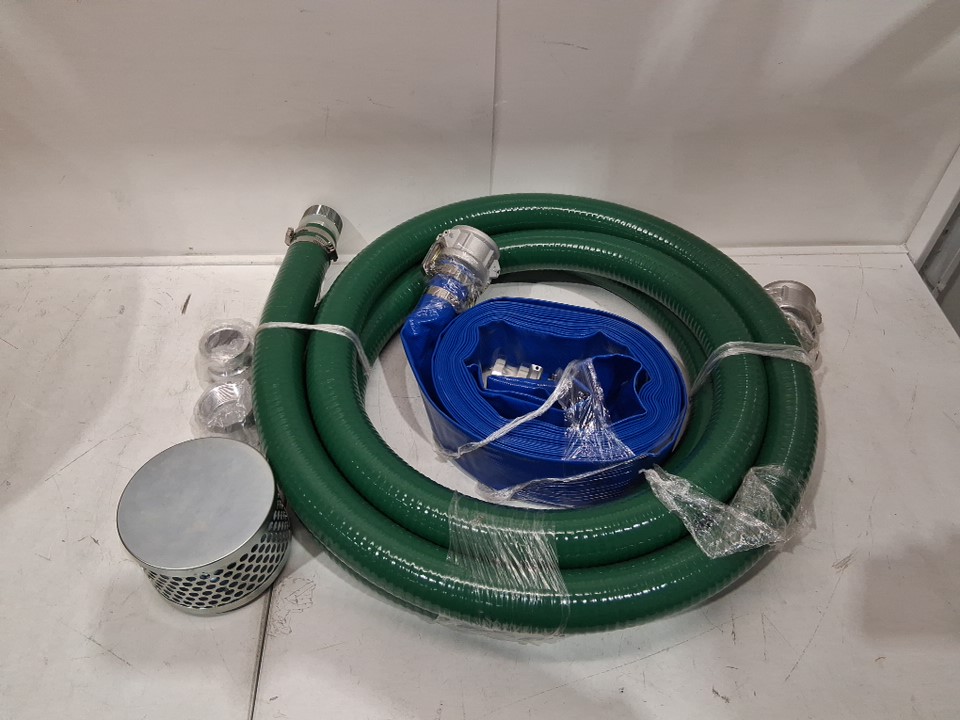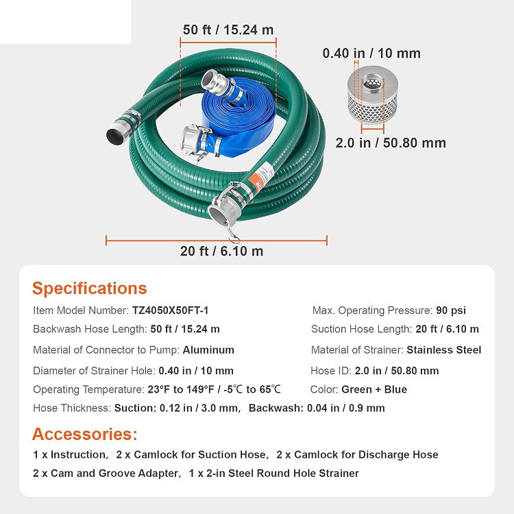 5pc Suction Hose Kit for Water Pump Blue Backwash Hose, Green Suction Hose, and Steel Round Hole Strainer, Camlocks, Clamps, Cam & Groove Adapter, for Multiple Purposes - 20ft / 50ft / 2" - green / blue - (model: tz4050x50ft-1)