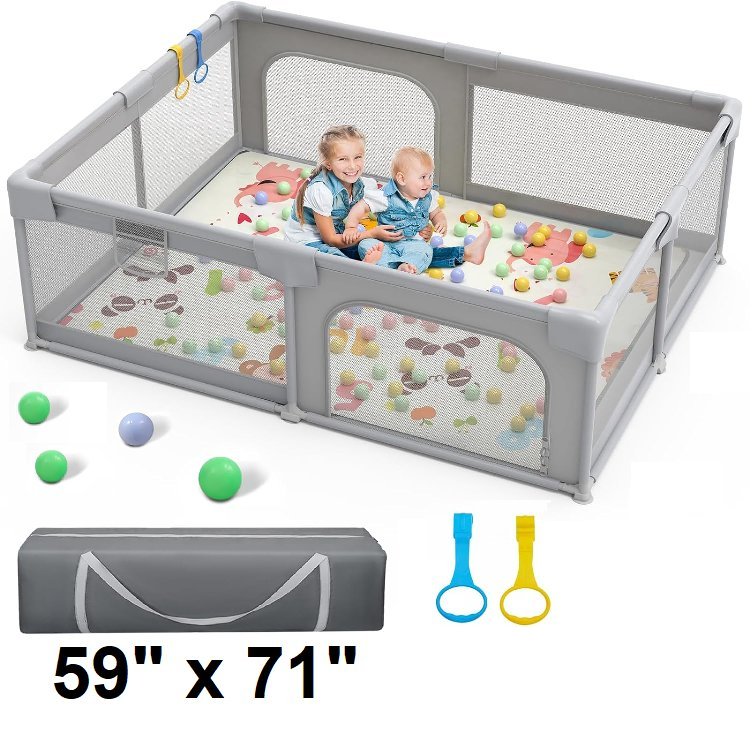 Palopalo Baby Playpen Activity Center with 8 Suction Cup Bases, mat AND SOFT BREATHABLE MESH - 59" X 71" - GREY (MODEL: pl-bwl-004)