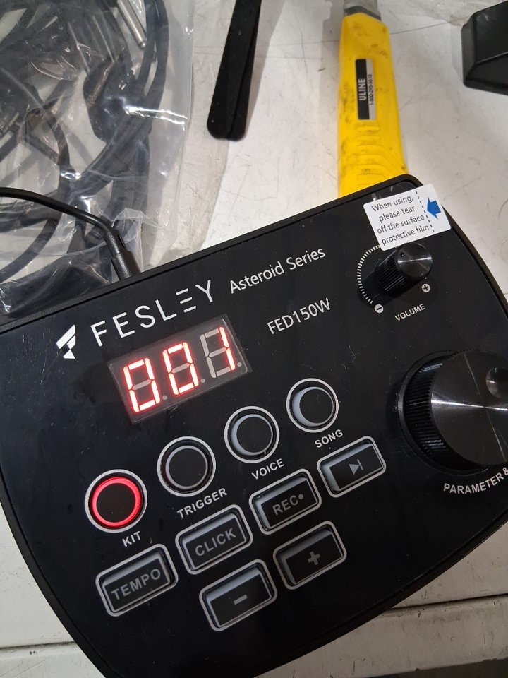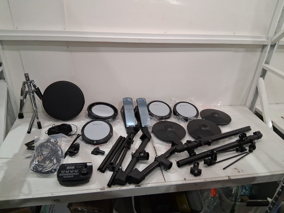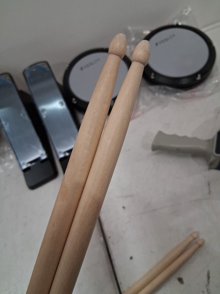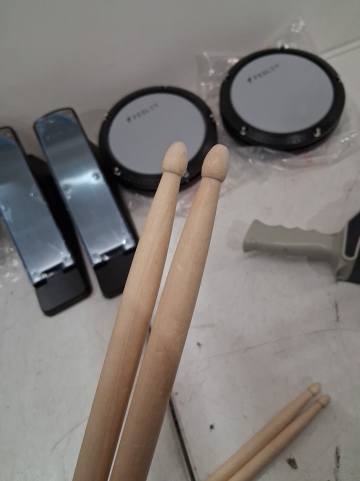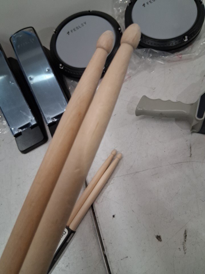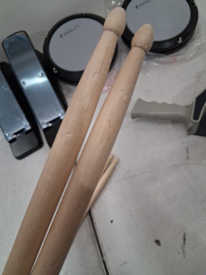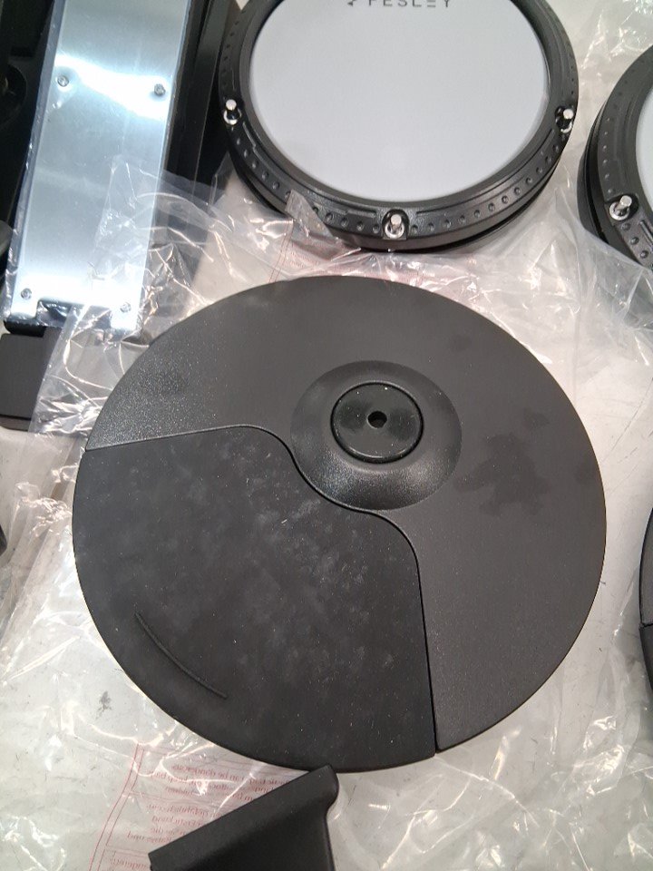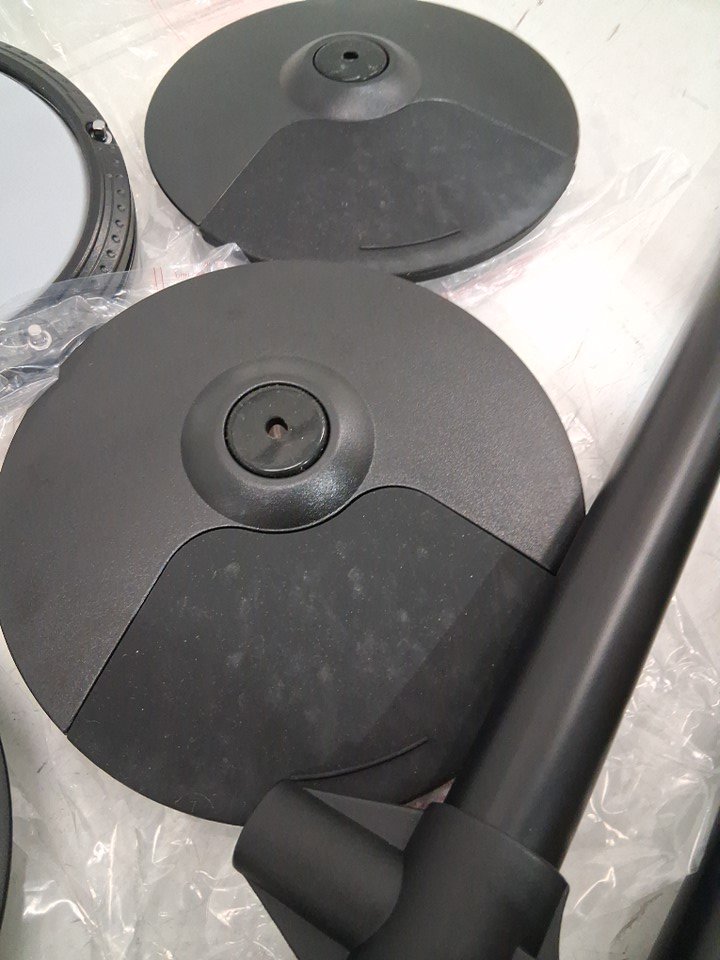 item has some light marks on cymbal pads and drumsticks and some of the assembly points have some light wear from previous light use item tested for basic power general hardware may be required for assembly
