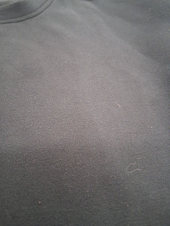 Has previous wash scent, and fabric has light pilling and has some loose hairs/fibers on it