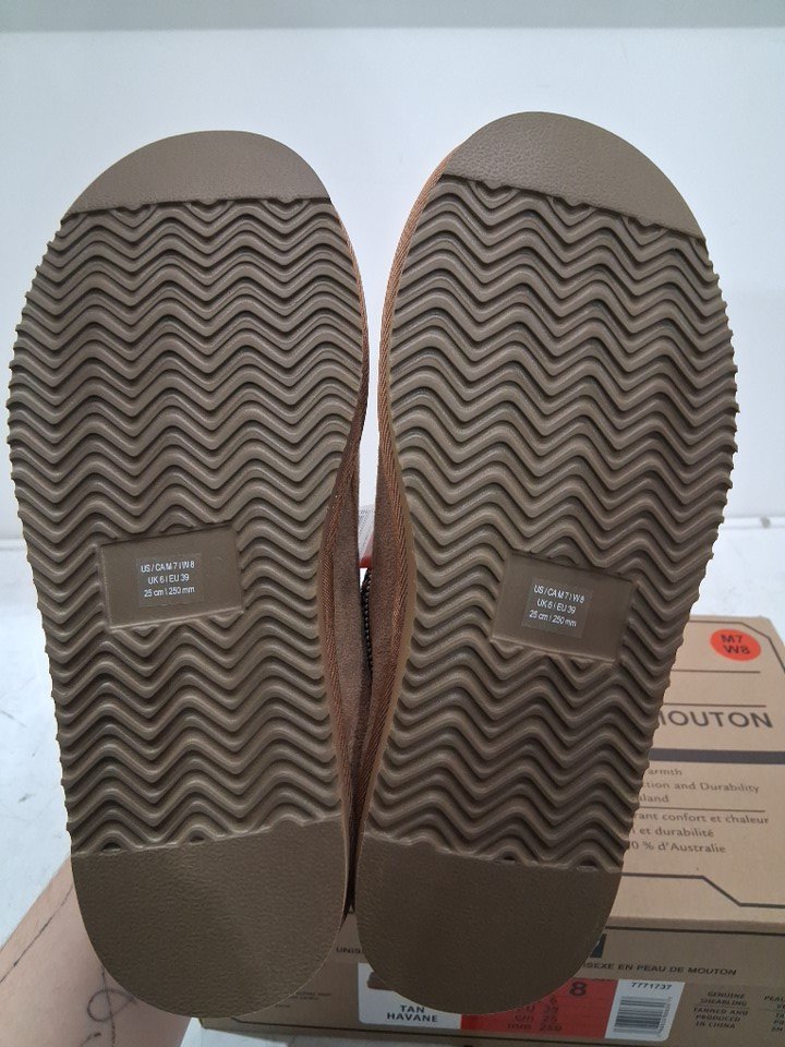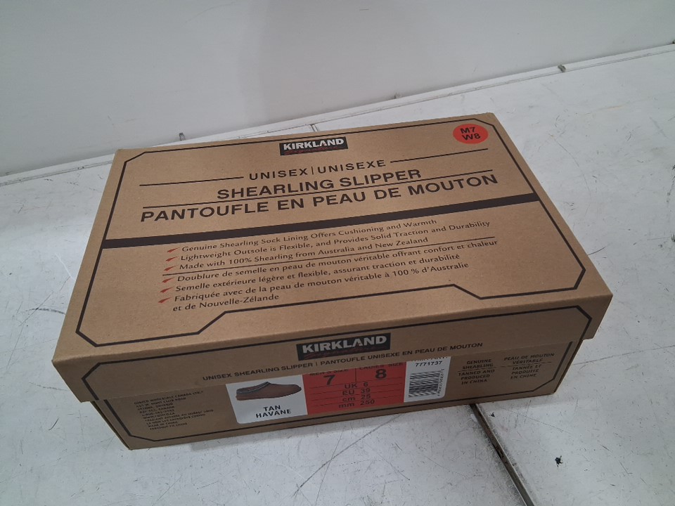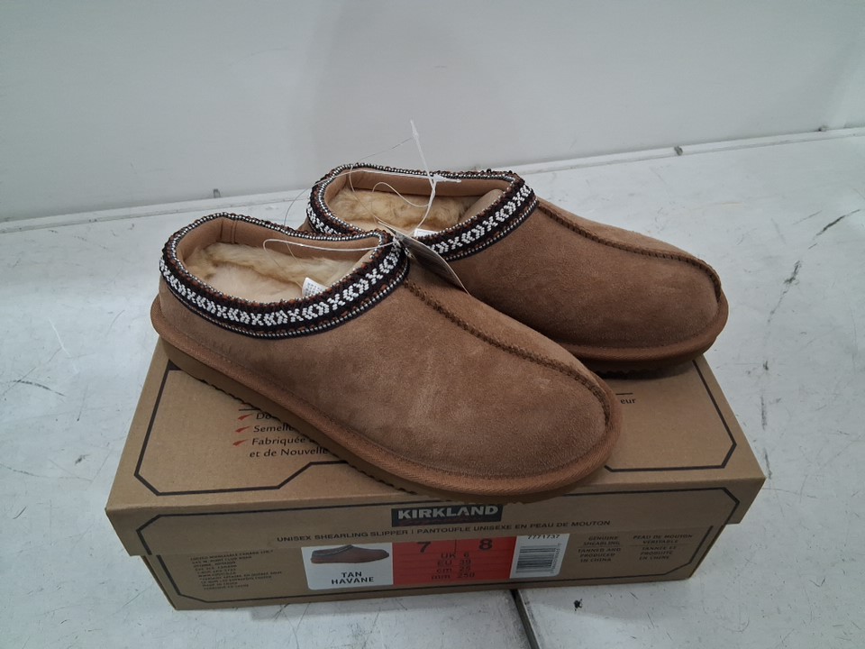 adult UNISEX KIRKLAND SIGNATURE SHEARLING SLIPPERS - MENS: 7/ WOMENS: 8 - tan brown (MODEL: 7771737)
