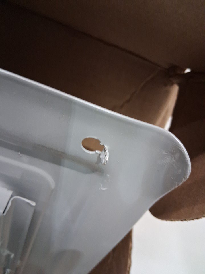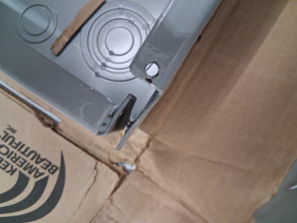 Top right corner of front panel is bent; Top left corner of main box is broken/detached (see photo)