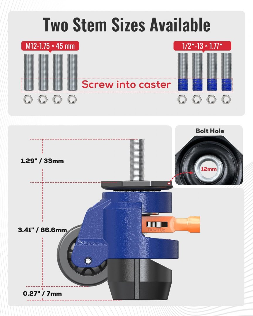 KOSTANZO Leveling Stem Casters Set of 4 Heavy Duty Retractable Caster Wheels - 1650Lbs