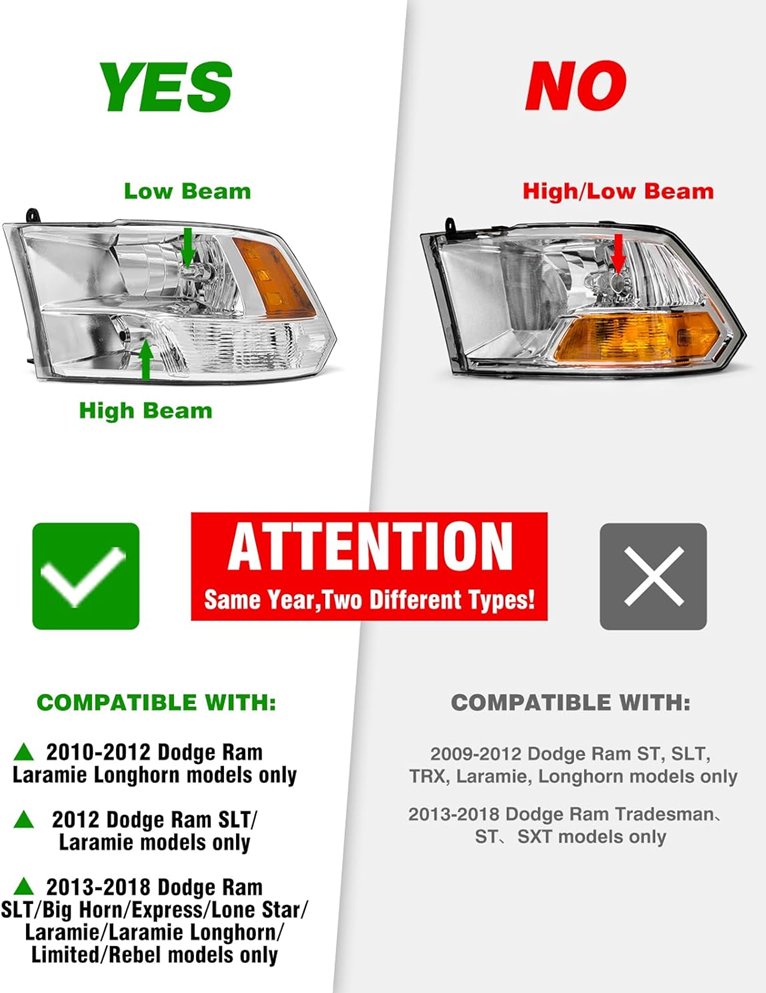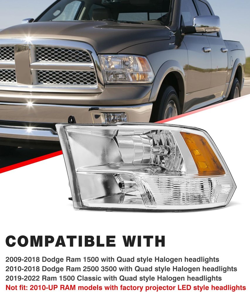 2pc ADCARLIGHTS Headlights left/right compatible with dodge ram models - black/A-chrome Housing Clear Reflector (model: 09rm)