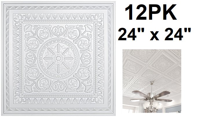 12PK Art3dwallpanels High Grade PVC Ceiling Tiles - 24"X 24" - COVERS 48SQ.FT - white (model: a10at906wt12caz)