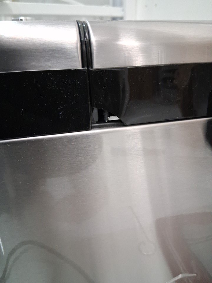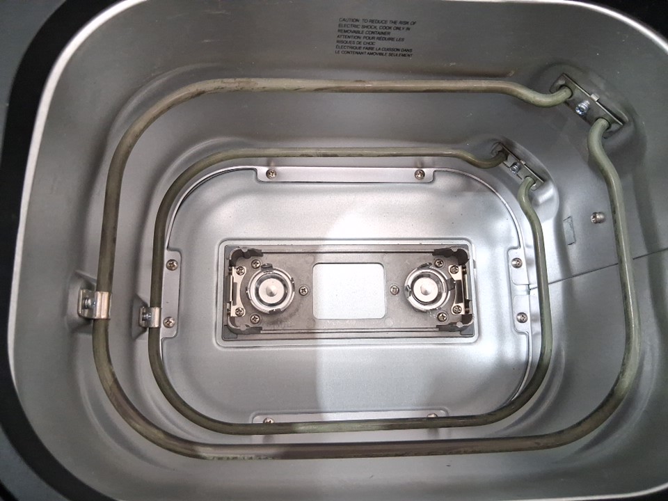 Small piece of plastic broken on the back and light denting on the lid Light charring on the element from previous use. Tested for power