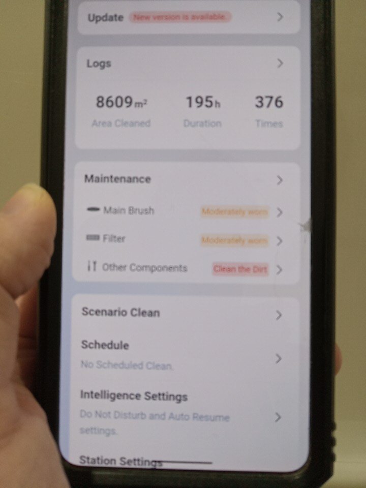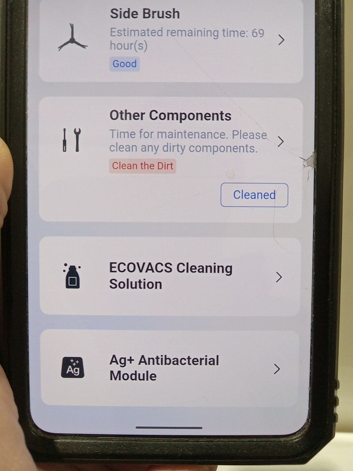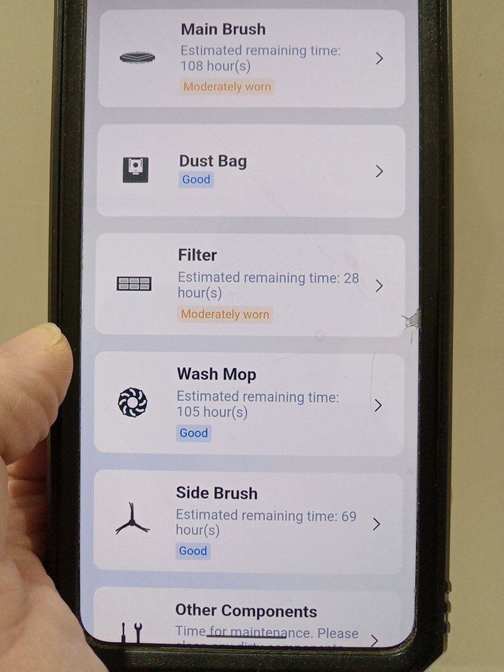 Item tested for power, charging, basic functionality and wifi/app connectivity. Unable to fully test item due to it's nature and the limitations of our network. There is dust/debris on/inside both the robot vacuum and base station as a result from previous use. There is light wear on the main brush and mop pads as well. Item marked with having issue as it is missing the side brush and the base station plastic plate attachment (which may or may not cause issues with the robot vacuum going into/out of the base station). Also we noticed that there are components/accessories according to the maintenance health in the app that could use some thorough cleaning. See attached photos for everything included with the item.