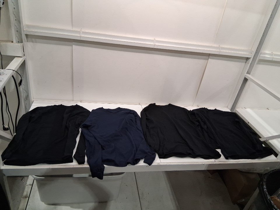 The shirts have a faint scent of fabric softener indicating that they may have been washed and potentially previously worn, but they otherwise appear new. Please note that there are three black shirts and one blue shirt (see photos)
