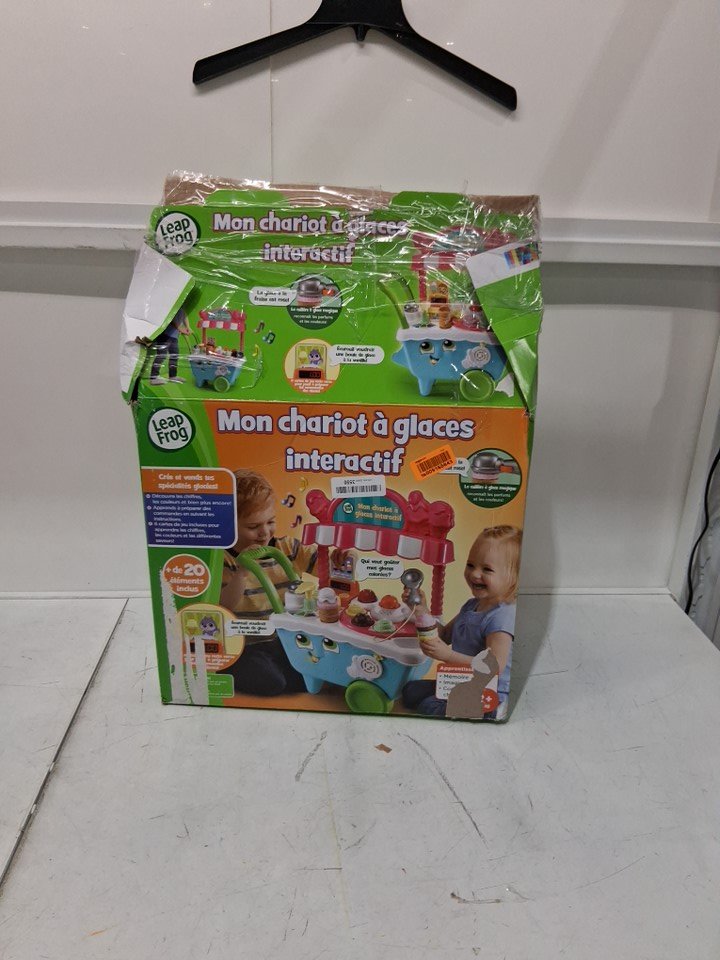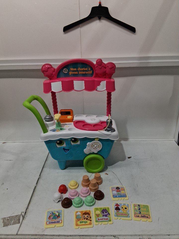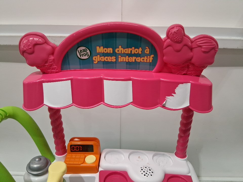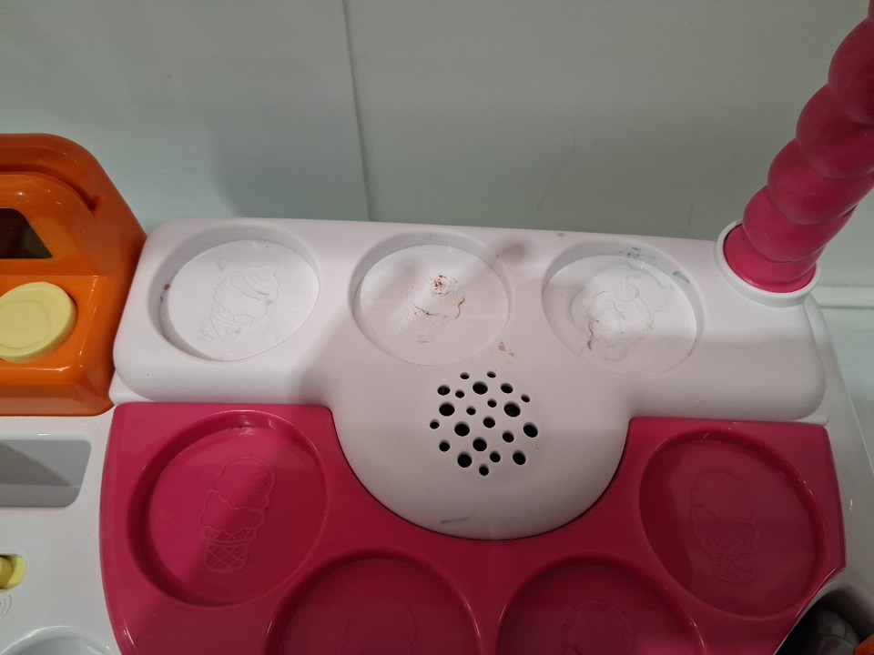 item is missing a few accessories ( vanilla scoop, orange topping ) item also has residue on the ice cream station and sticker at the top is ripped off partially ( see photos)