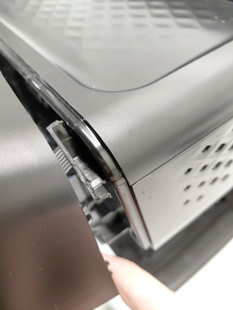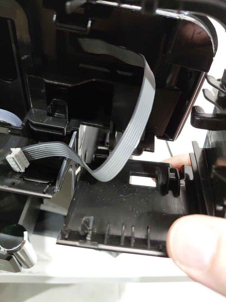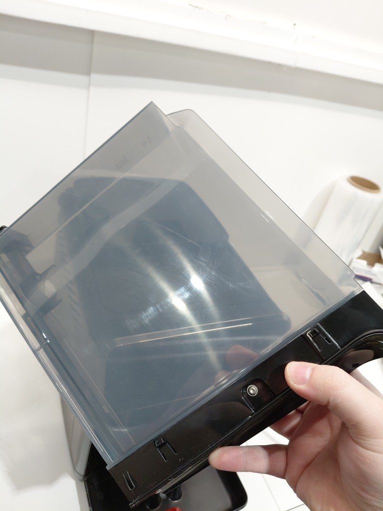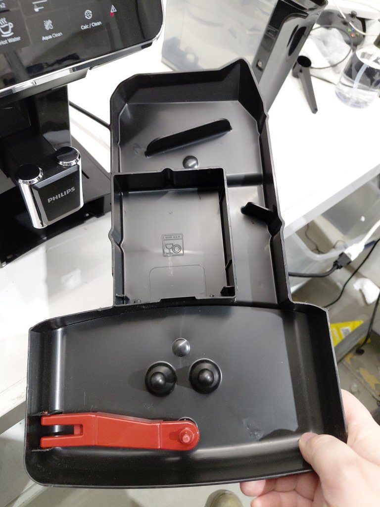 has a crack on the front trim causing it to be loose missing: lattego cup, tray accessories & lids infuser is stuck inside tested for power