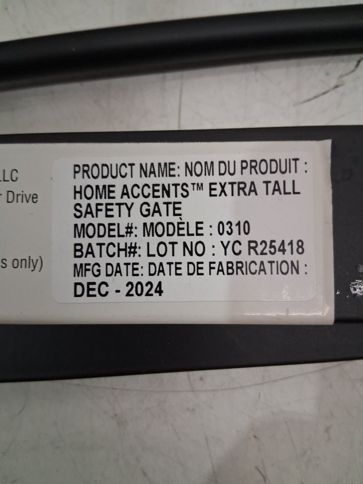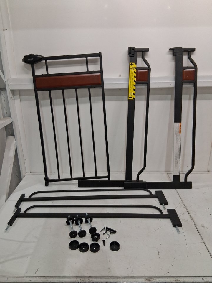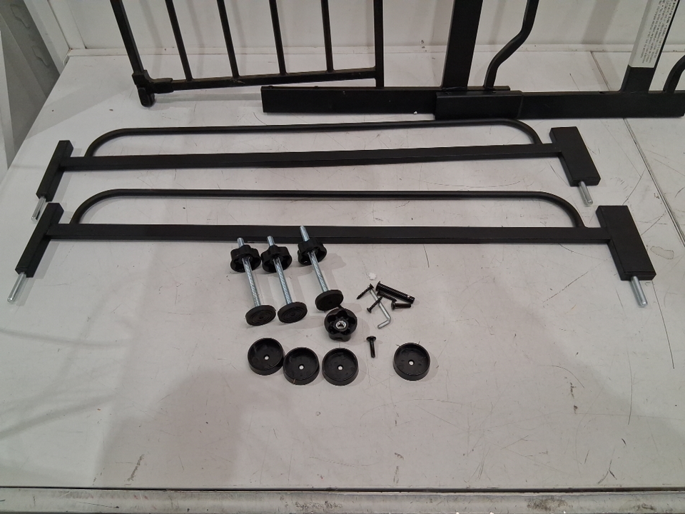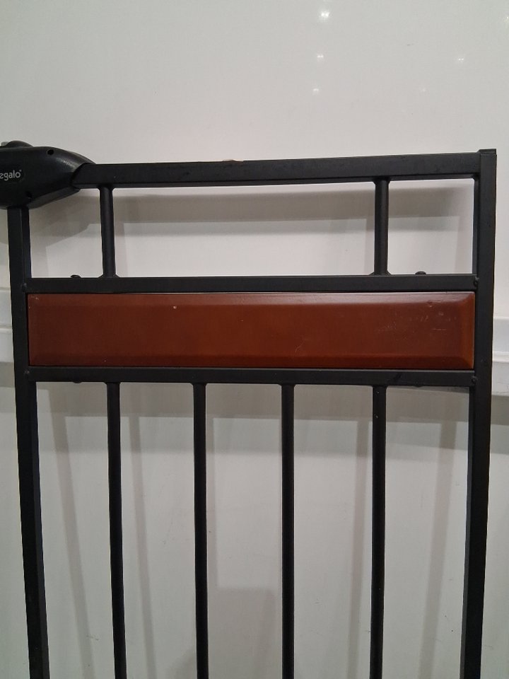 Please note the gate shows signs of previous use with some scratches and scuffs around the bar and wood and one of the wall pad pieces is missing, see photos.