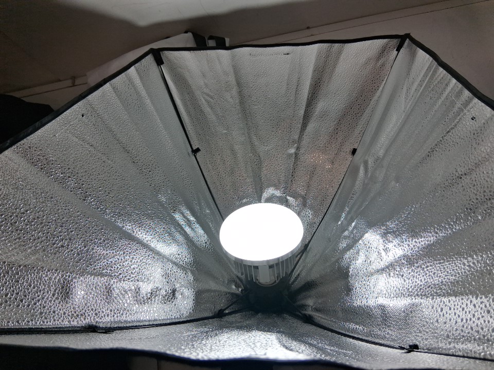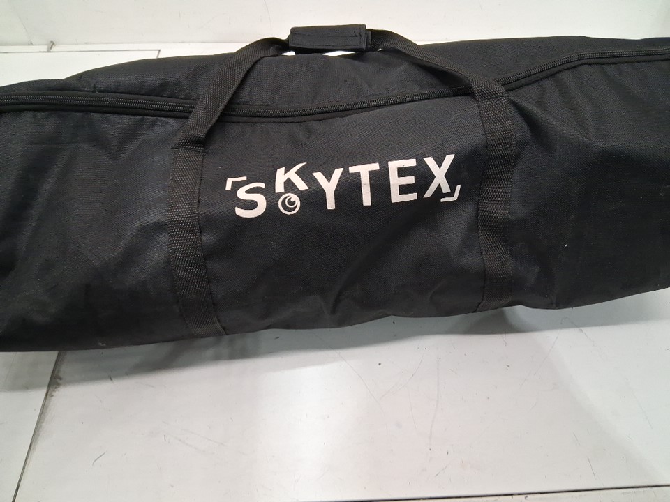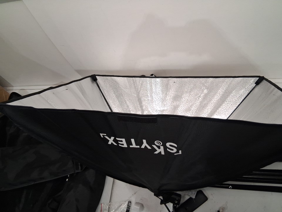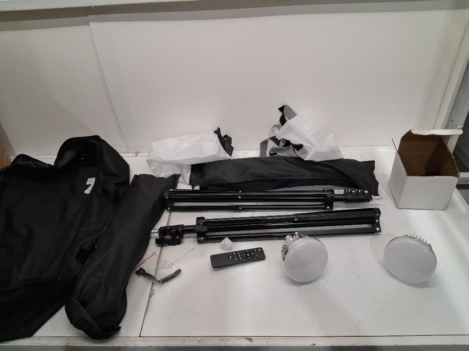 The bag has a tear on one side - One of the bulbs does not work, some light scratches/scuffs on tripod legs (see photos)