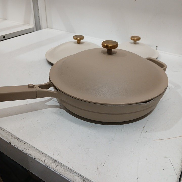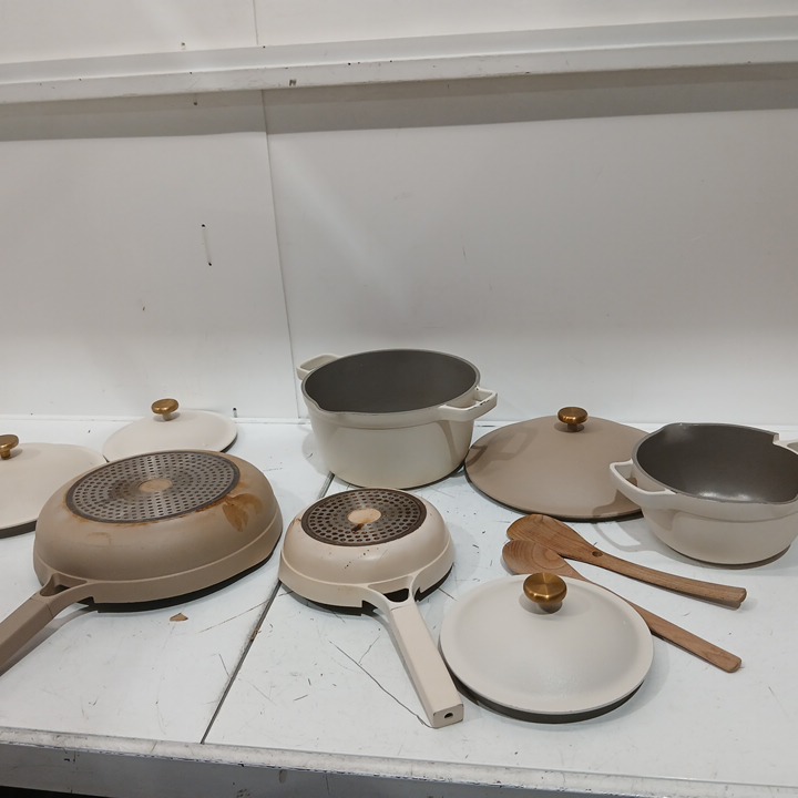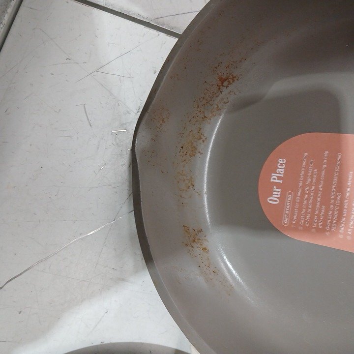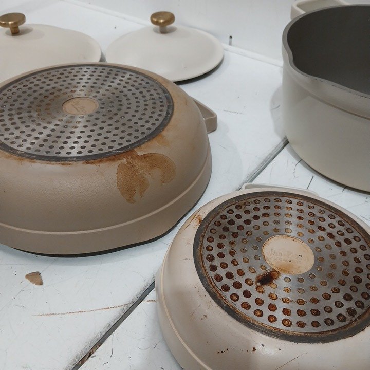 there is cooked on marks/cooked on food some scuffing on the outsides of the pots/pans one of the pans is a brown