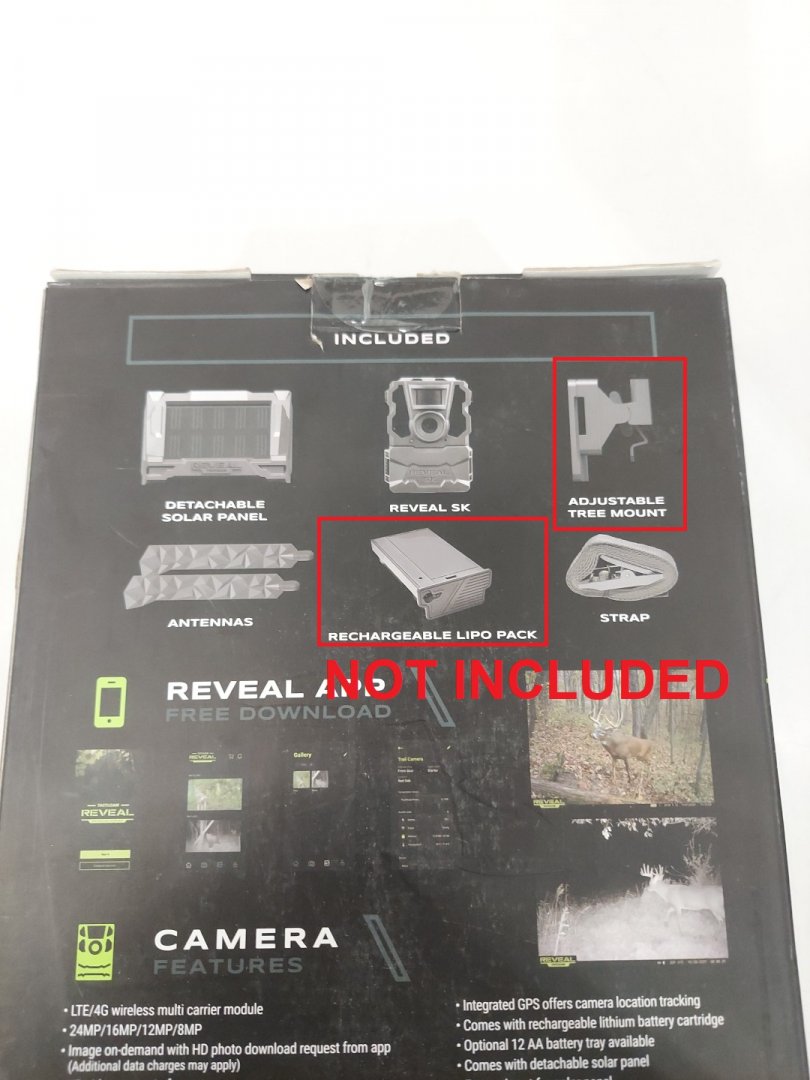 Please note that this item arrived appearing lightly used and upon inspection the item is meant to come with a rechargeable battery pack, and a tree mount but they were not included in the box. these can be replaced and the battery will need to be prior to use. tested for power and function with wifi & app connectivity using a battery pack they had on hand. Please note that this item only works via cellular network with verizon and at&t in the US but the item can still be used in canada with the app or locally by using an SD card.