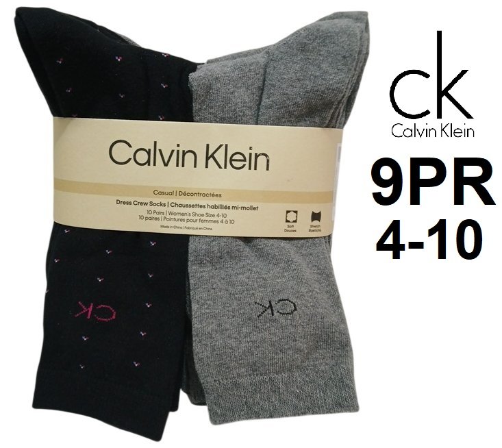 9pr women's calvin klein casual dress crew socks - size 4-10 - assorted grey black prints (style: 1579942)