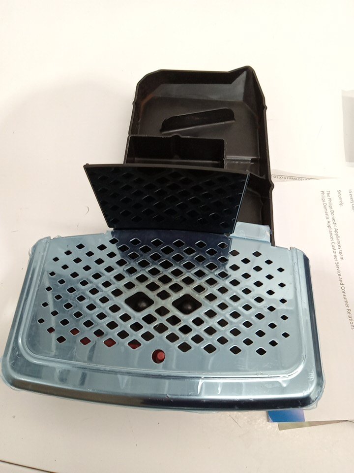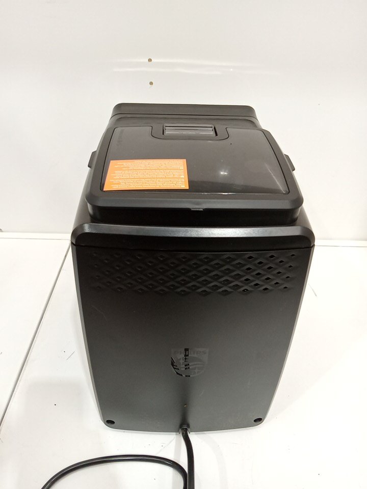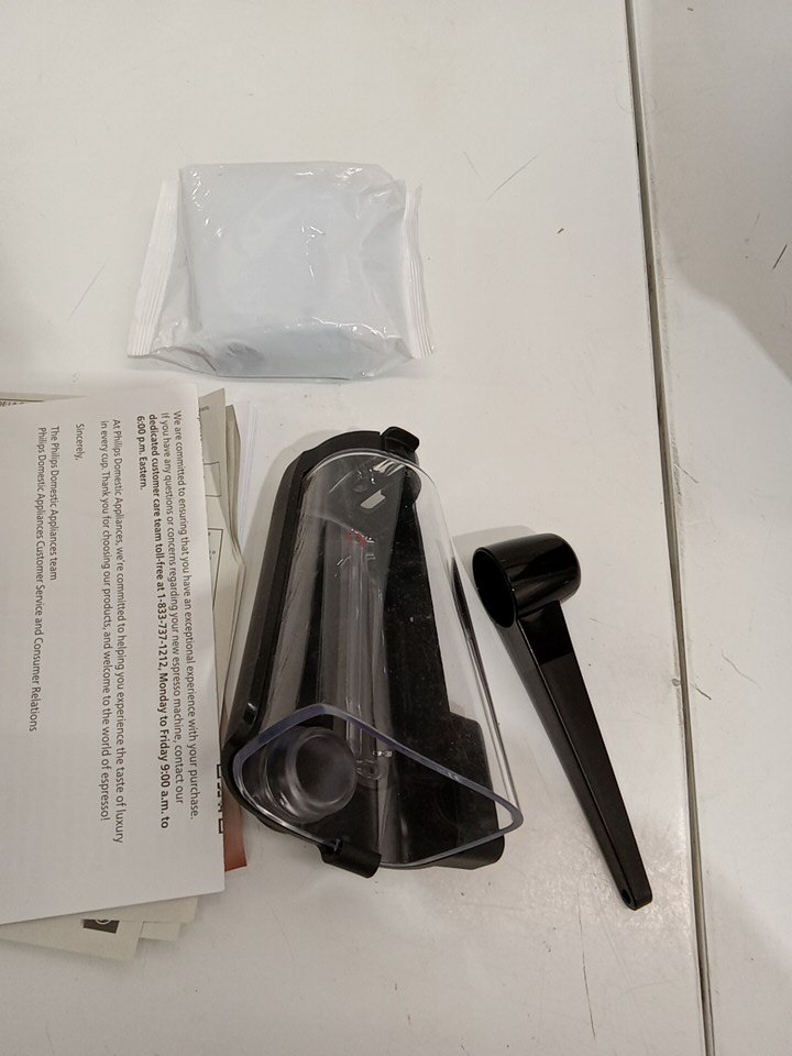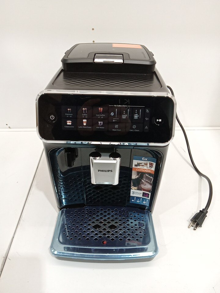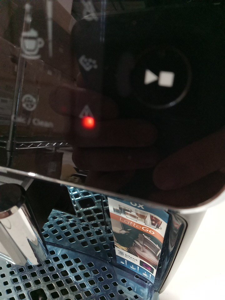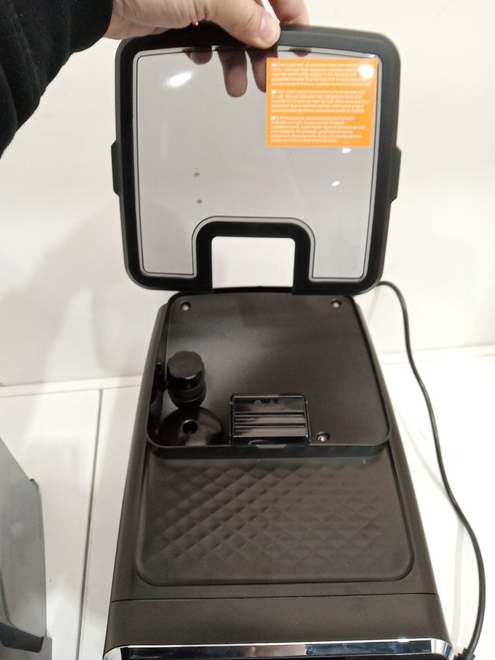 There is residual coffee grinds/coffee in parts of the item as a result from previous use. There may be some minor scuffs/scratches on some parts of the housing of the item. Item tested for power only. Unable to fully test the item due to it's nature. The item is being marked with issue as the LatteGo container is missing the lid and the plastic dump box (that goes in the middle of the unit). This piece is required in order for the machine to function (that's why when we power it on, it has the exclamation error.