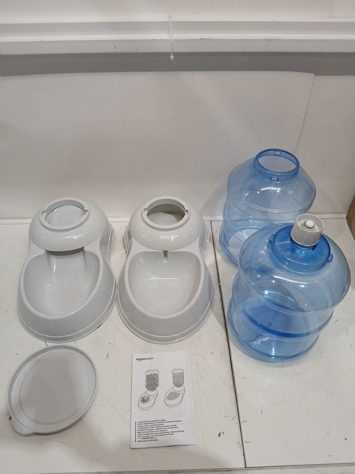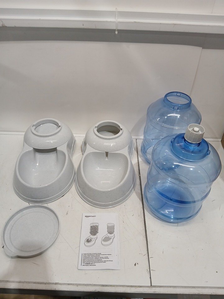 2pc AMAZONBASICS GRAVITY PET FOOD FEEDER AND WATER DISPENSER BUNDLE SET - 9.5L/3.5gal(LARGE) - blue/grey (MODEL: ‎11021/11022-APL)