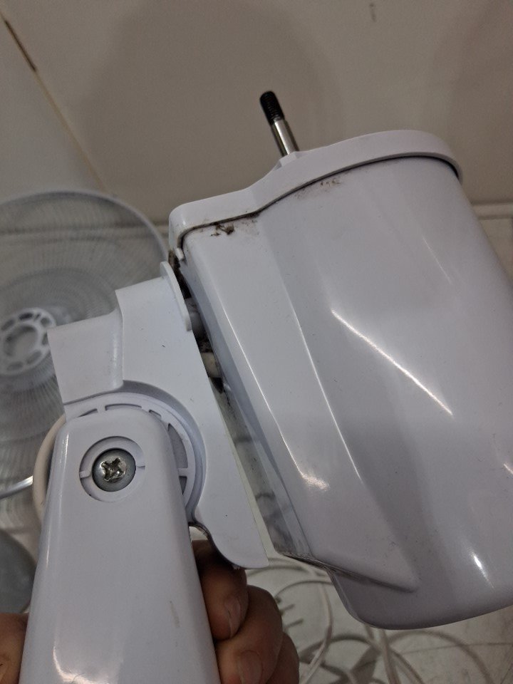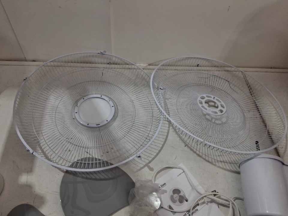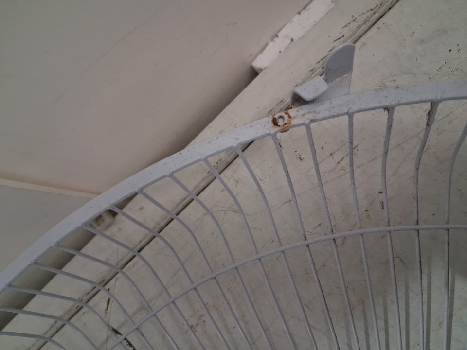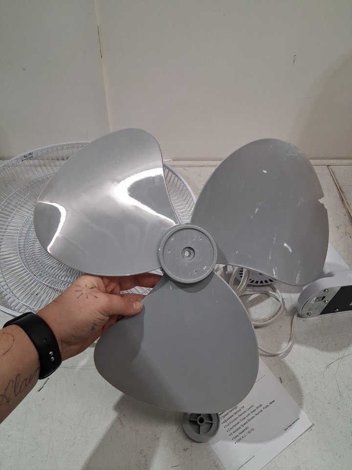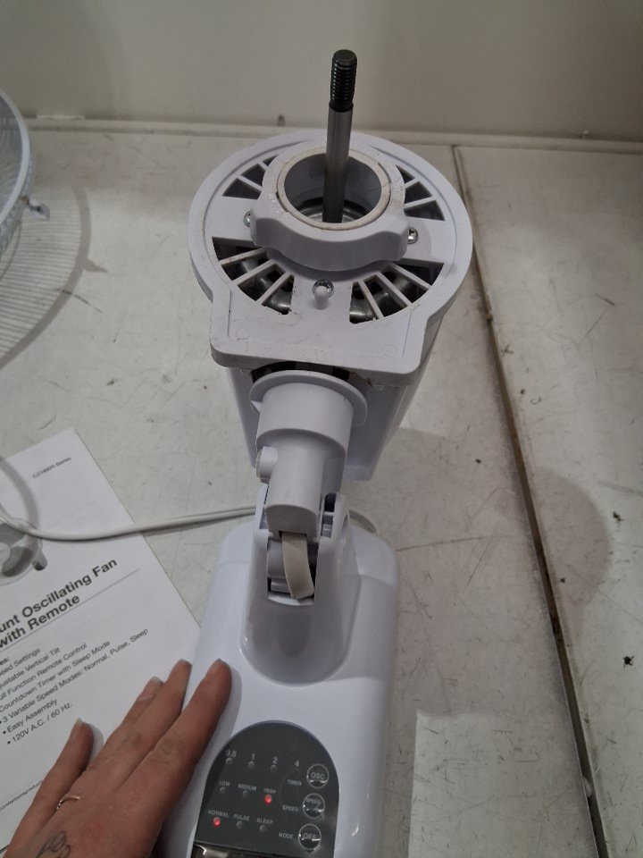 item has some dust build up in fan head/motor there is also some light rust spots where the fan cage clasps from previous light use please note there is a small chip out of one of the fan blades and the remote is missing but can still be controlled from base please note bolt may need to be adjusted to move fan head