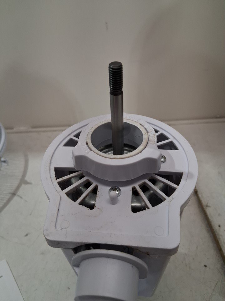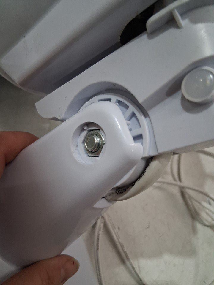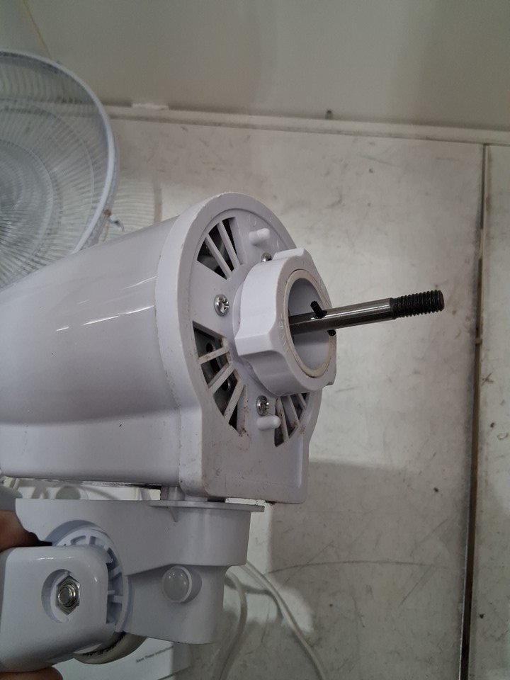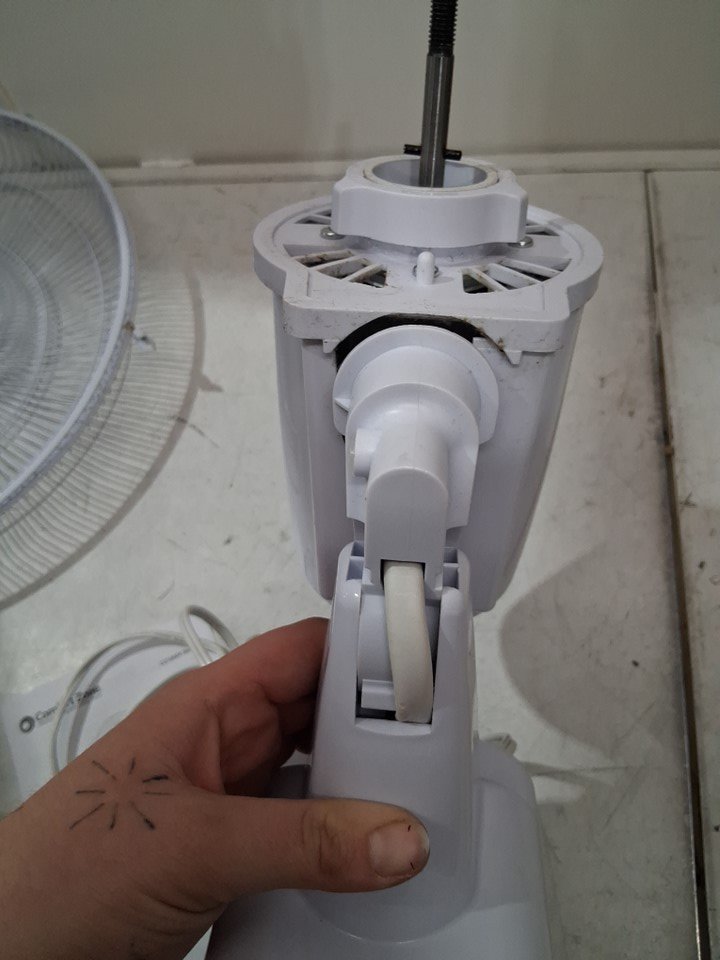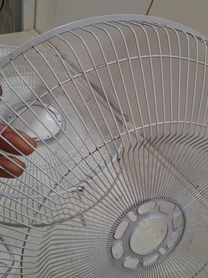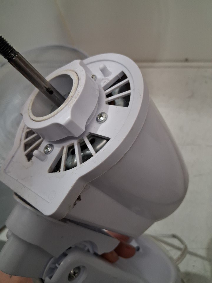 item has some dust build up in fan head/motor there is also some light rust spots where the fan cage clasps from previous light use please note there is a small chip out of one of the fan blades and the remote is missing but can still be controlled from base please note bolt may need to be adjusted to move fan head