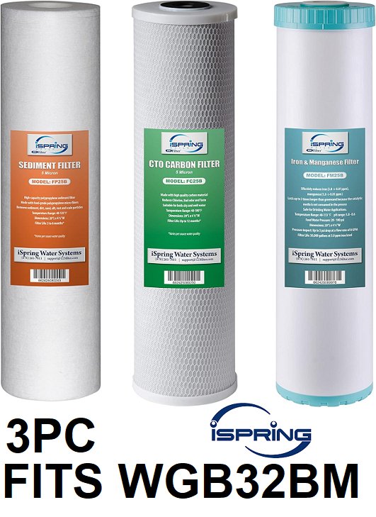 Spring Whole House Water Filter Pack WITH Sediment, Carbon Block, and Iron & Manganese Reducing Cartridges - FITS WGB32BM (model: F3WGB32BM)