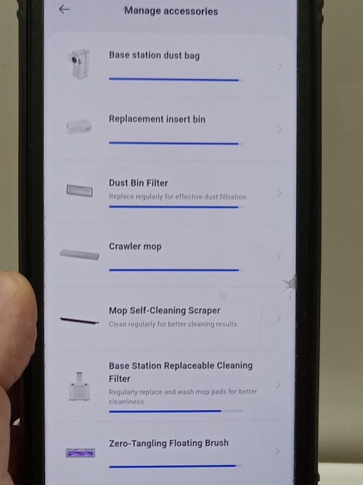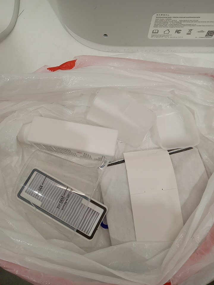 Item tested for power, charging, basic functionality and wifi/app connectivity. Unable to fully test item due to it's nature and the limitations of our network. There is light wear on the side brushes, main brush and mop roller as a result from previous use. There is some dust/debris on/inside both the base station and the robot vacuum as well. See attached photos for everything included with the item.