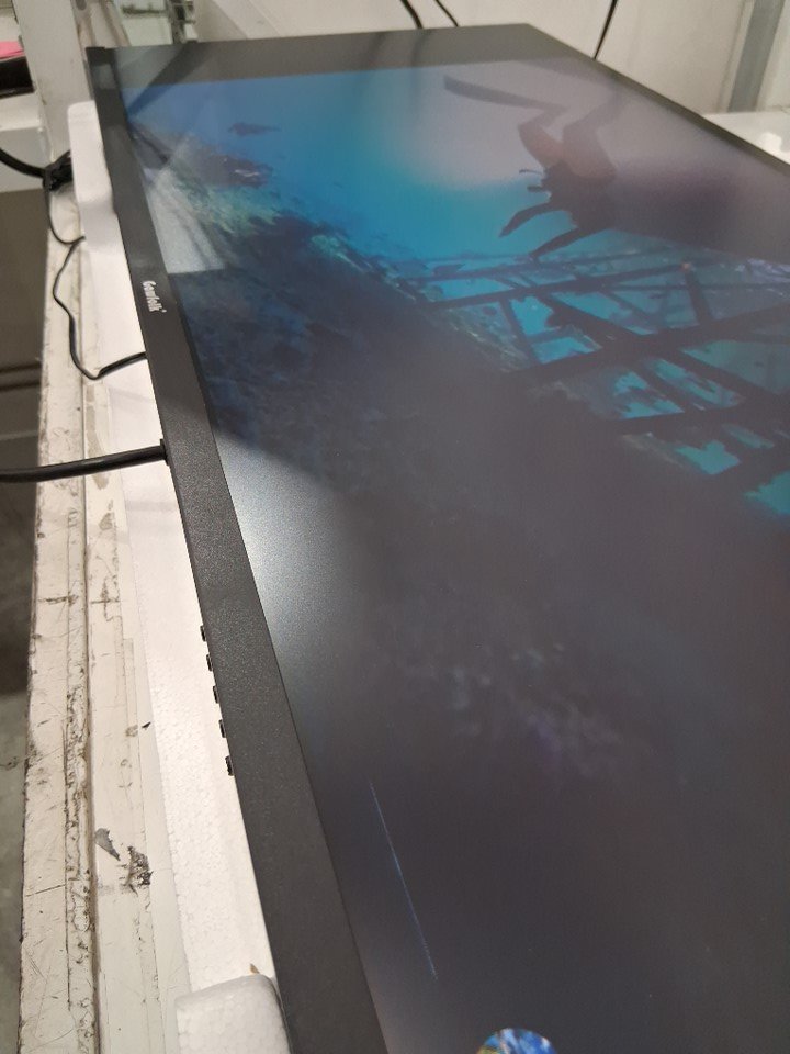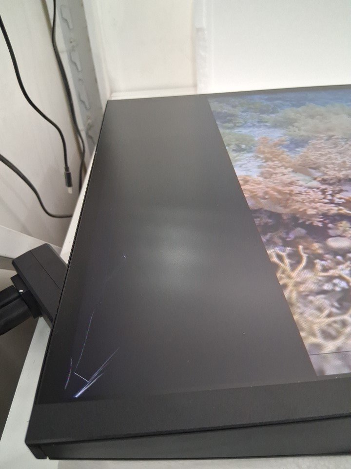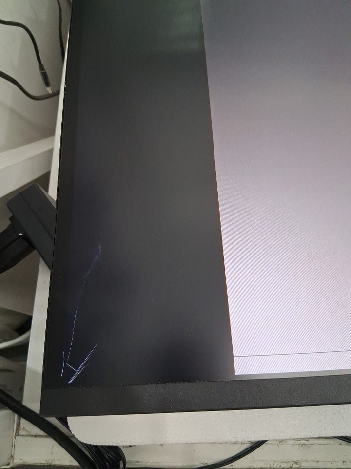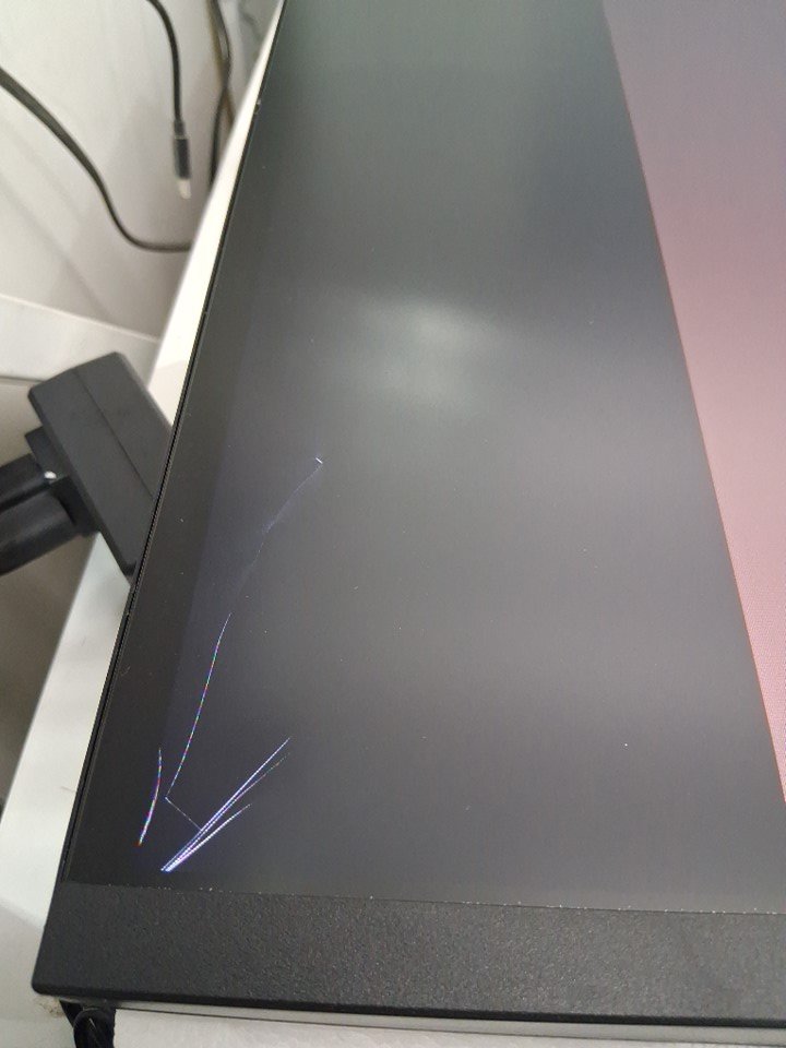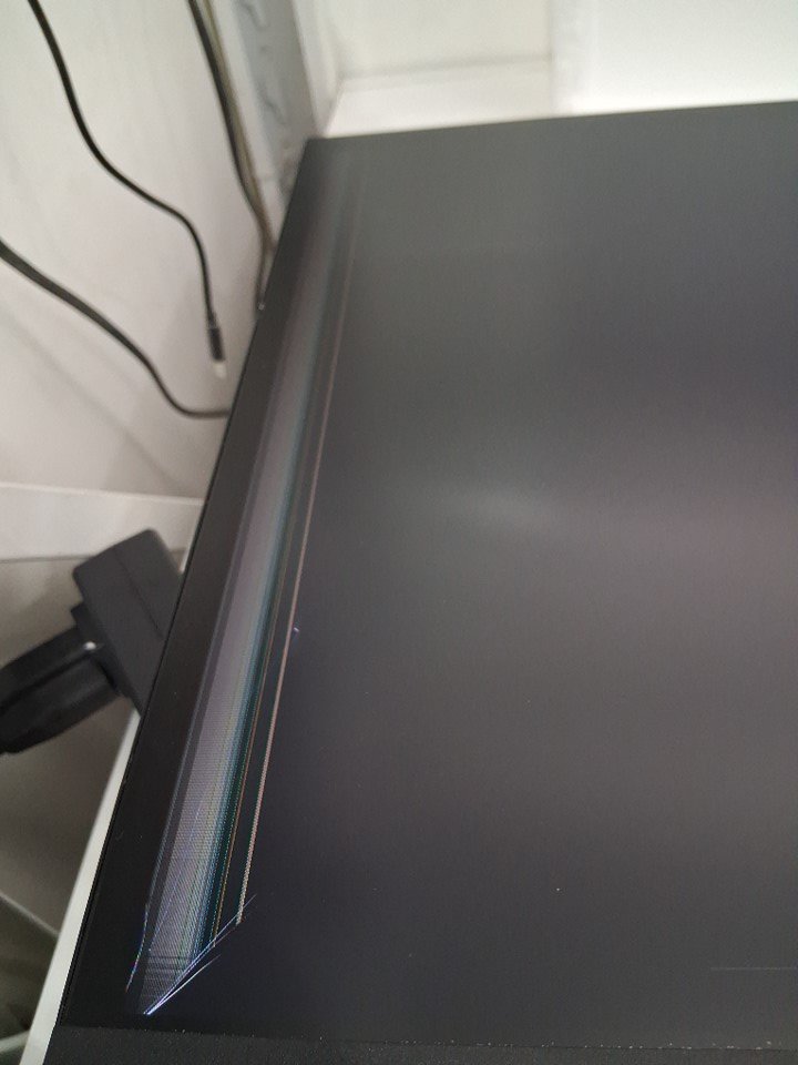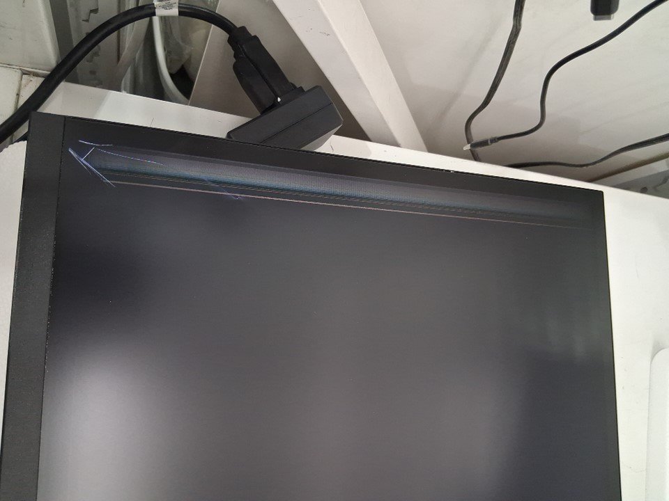 monitor has a small crack on the bottom left side of the screen which makes a diagonal line that glitch's and sometimes fades ( it seems to appear most in wide mode) meanwhile has another firm horizonal line that you can see on the screen please refer to pictures tested for power and functionality