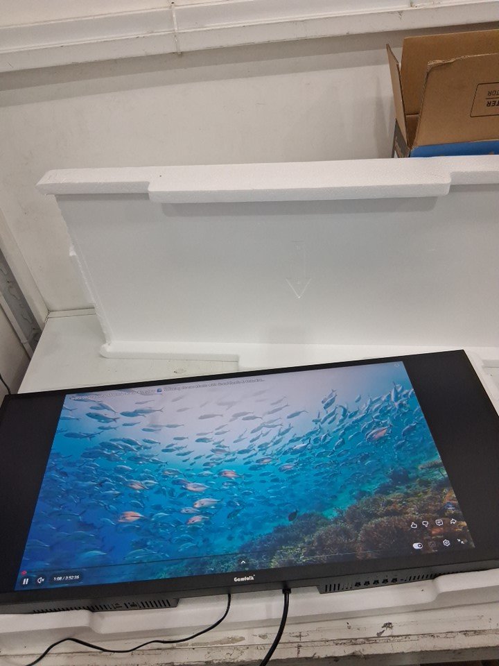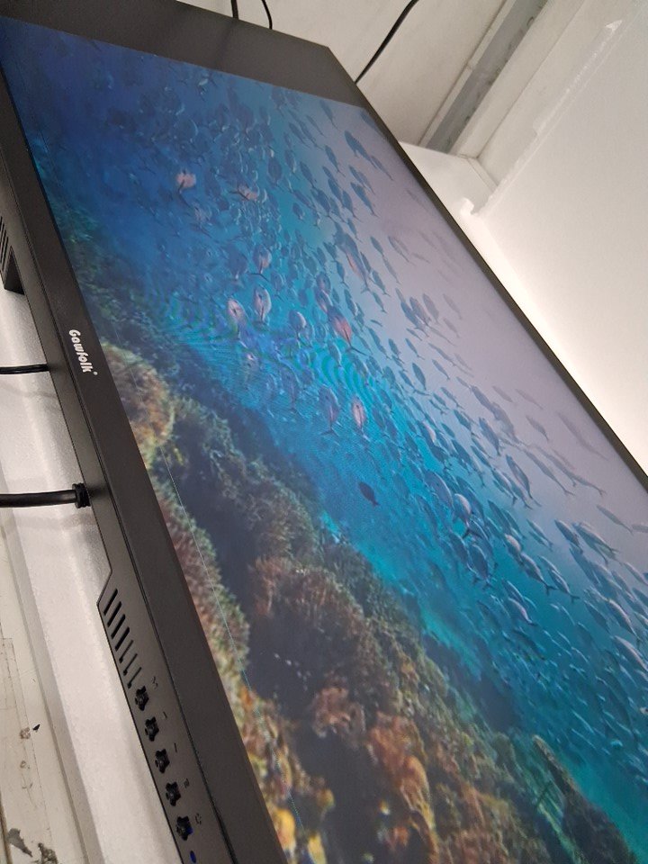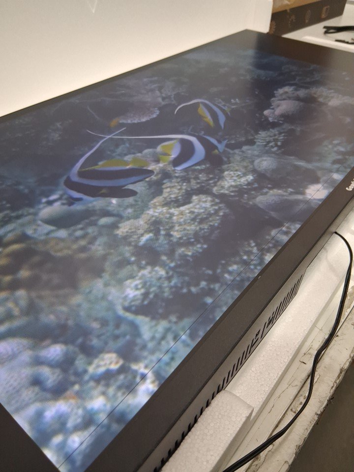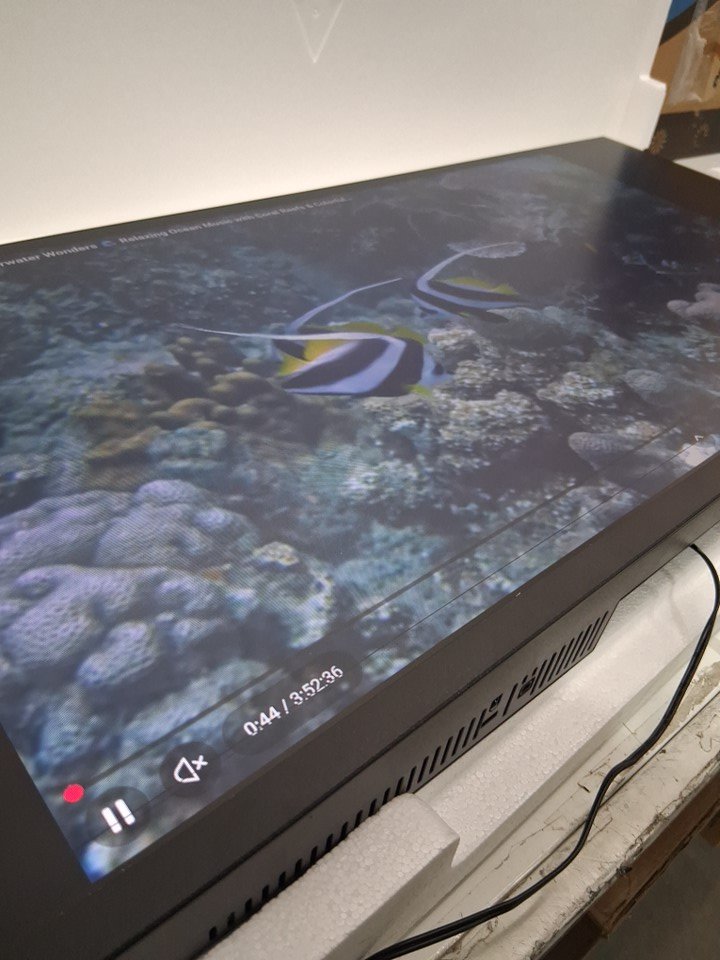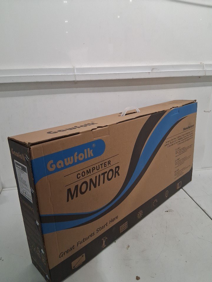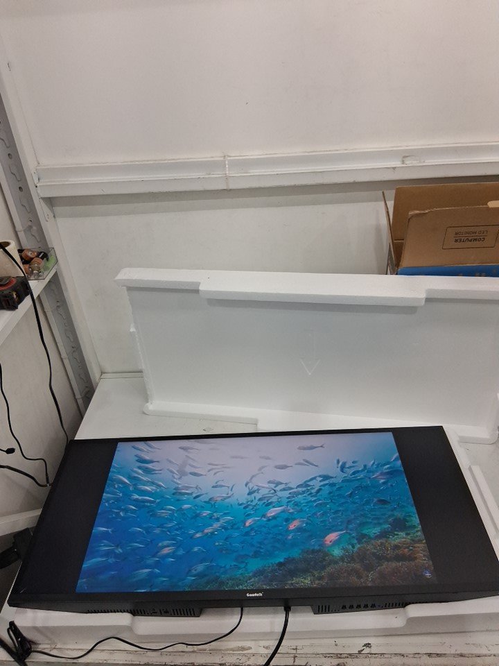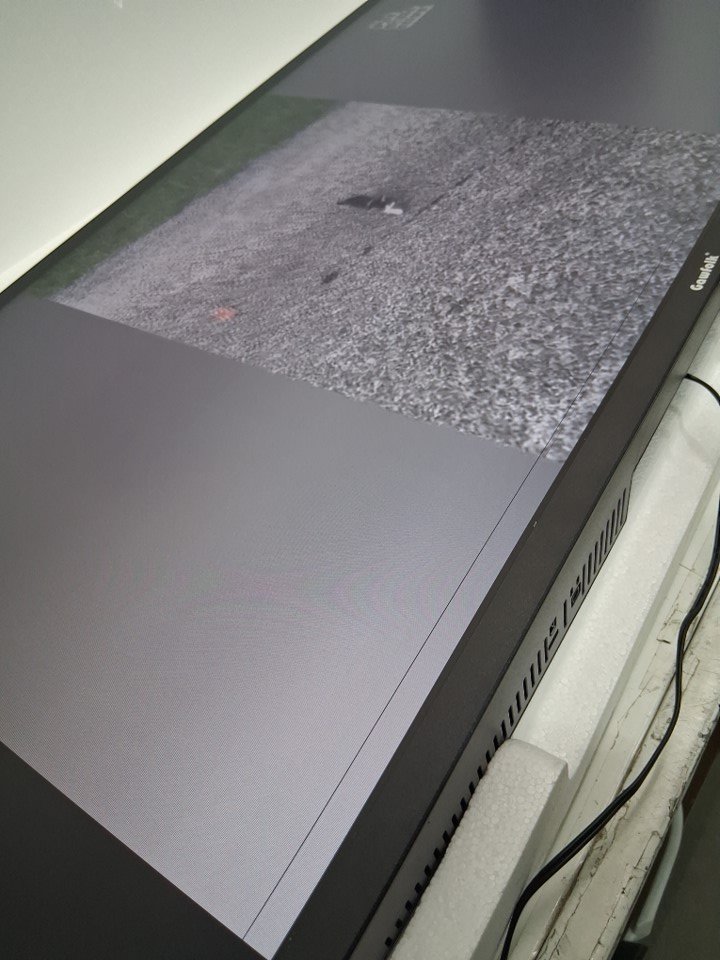 monitor has a small crack on the bottom left side of the screen which makes a diagonal line that glitch's and sometimes fades ( it seems to appear most in wide mode) meanwhile has another firm horizonal line that you can see on the screen please refer to pictures tested for power and functionality