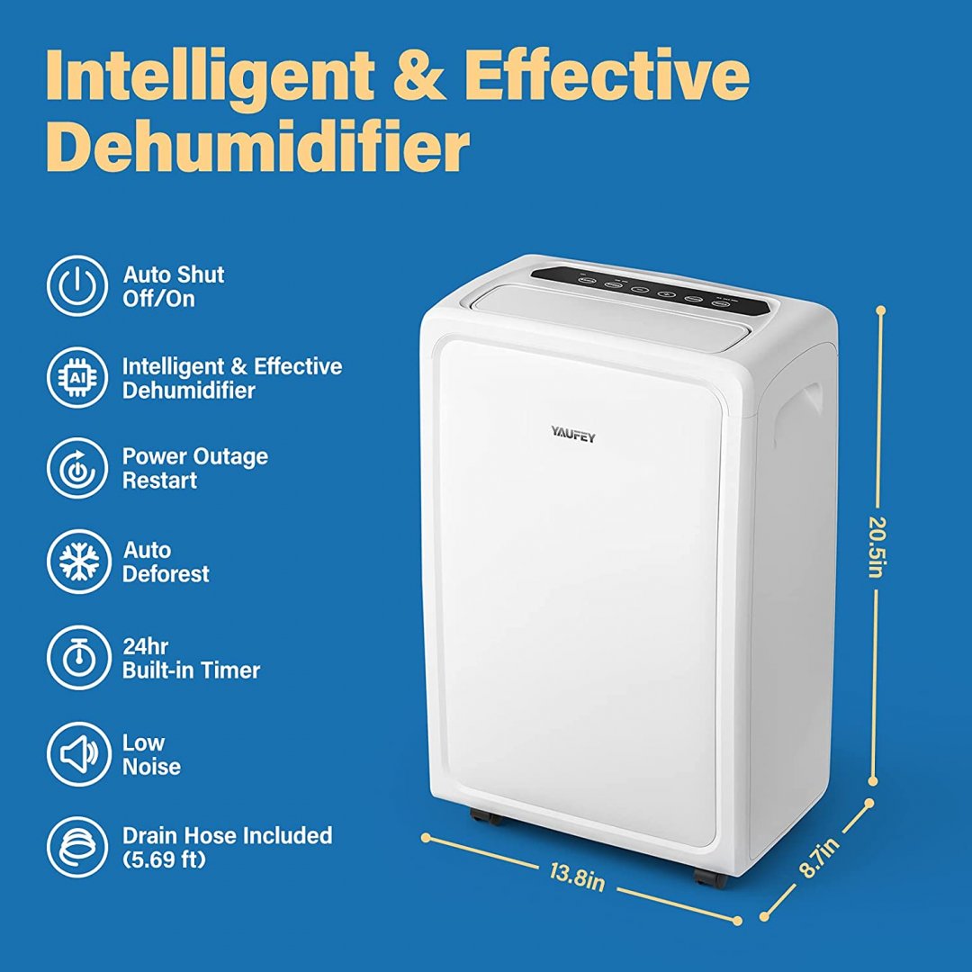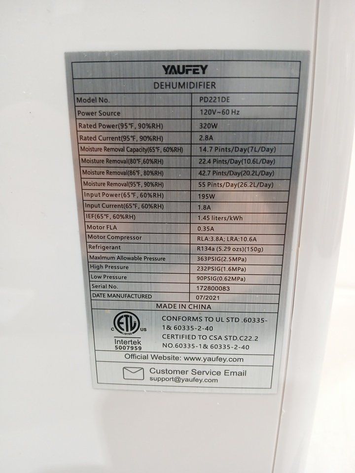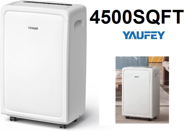 YAUFEY HOME DEHUMINDIFIER W/ DRAIN HOUSE & REUSABLE AIR FILTER - 4500 SQUARE FOOT COVERAGE - WHITE (MODEL: PD221DE)