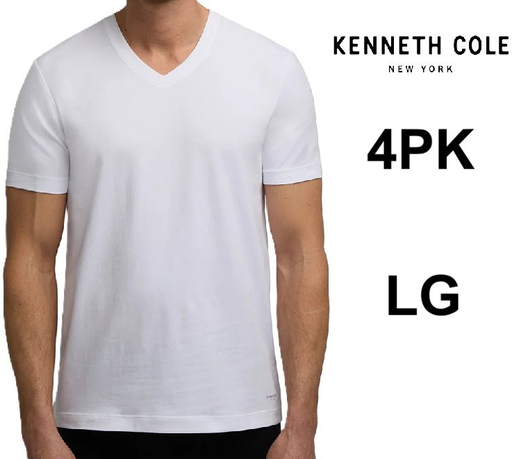 4PK Men's Kenneth Cole Cotton STretch V-Neck T-Shirts - Large - White (Style: 1915352)