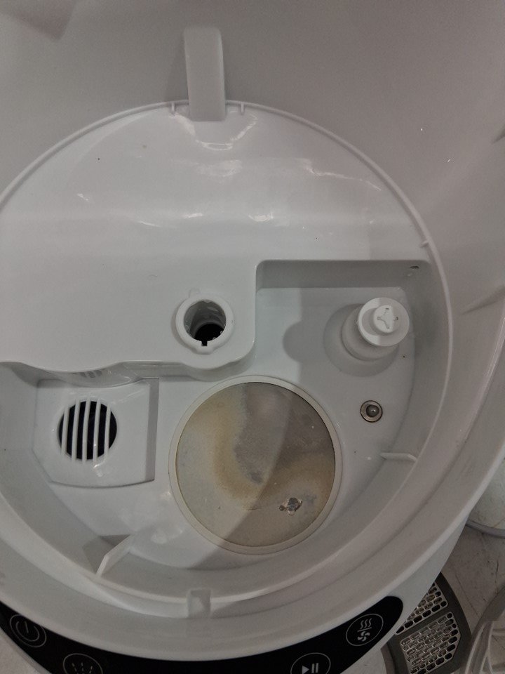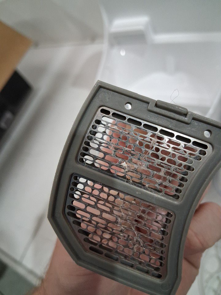 there is some debris that is present in the metal grate like piece and the filter is discolored and stained from previous use. product was tested for power