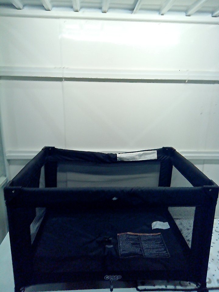 Ours is black/dark grey with a white inner mat piece with a moon and stars pattern. Ours can't be folded up all the way due to one of the sides not unlocking from the straightened position. That side is slightly bent downwards on the middle but stays locked in place when the crib is set up. (SEE PHOTOS)